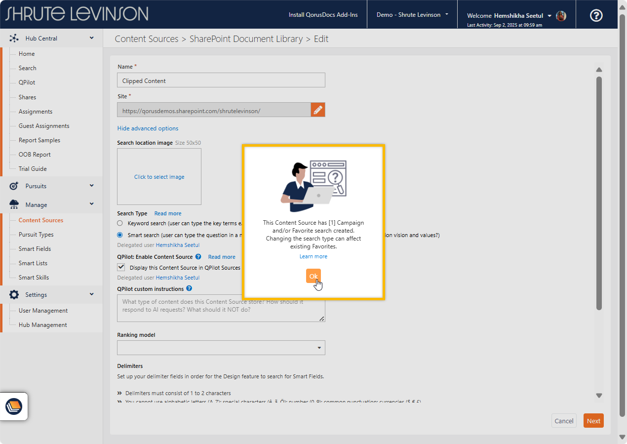 If you have a Campaign or favorite search created using a Content Source, you will receive this warning message upon changing the Search Type of that particular Content Source.