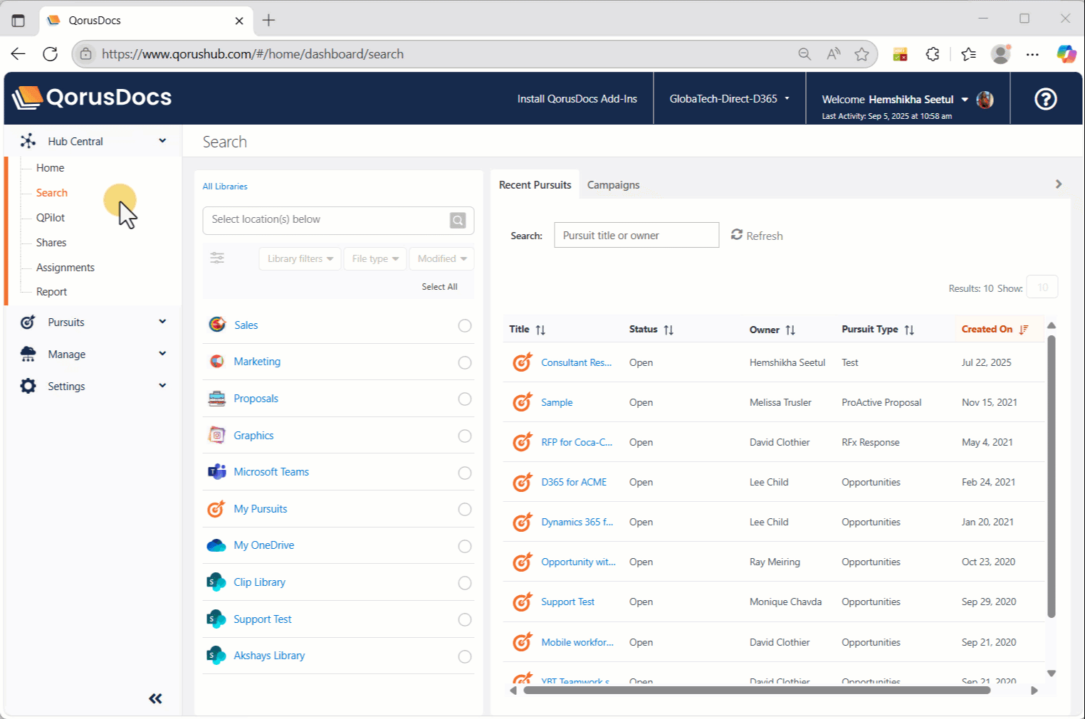 - Click on the OneDrive for Business content source in QorusDocs Hub.