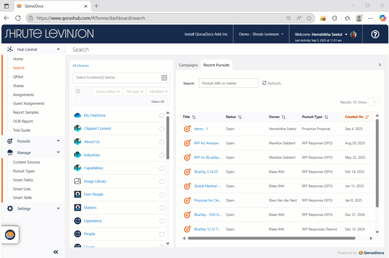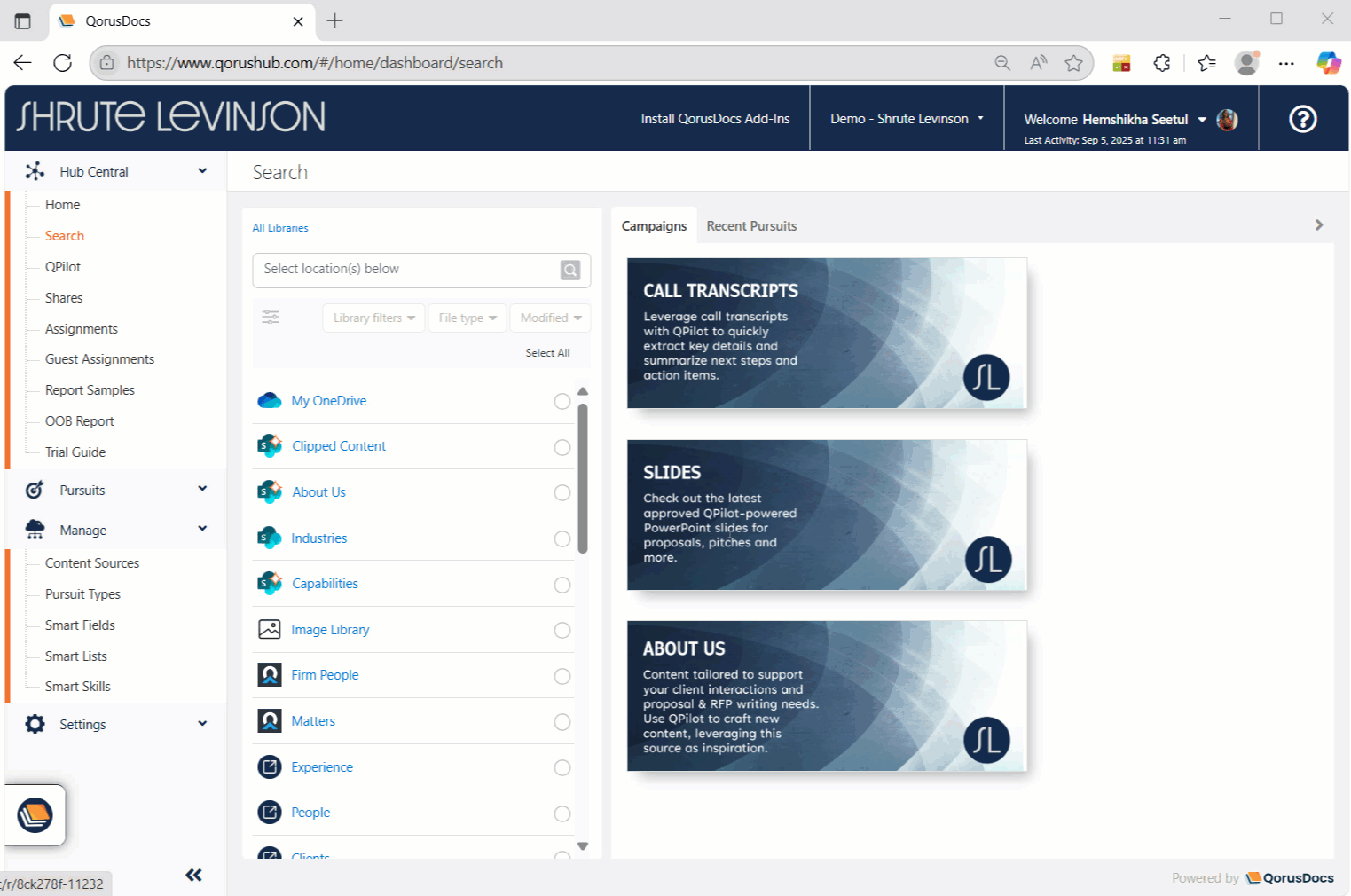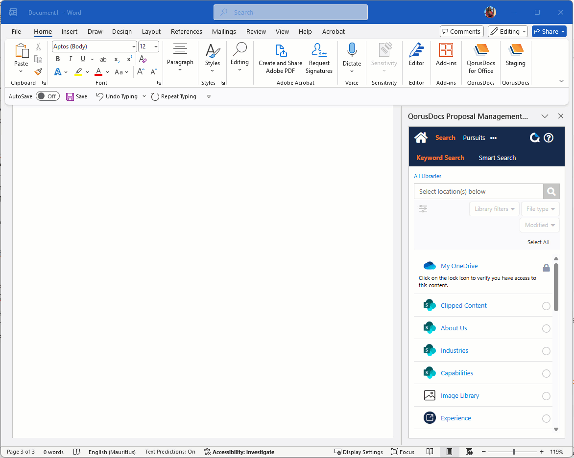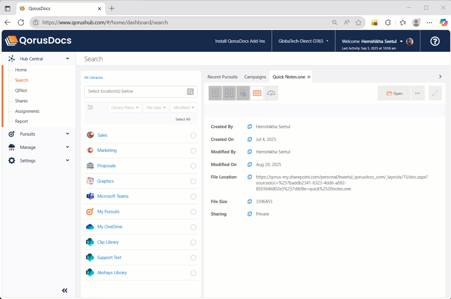 You can easily browse and preview files stored in SharePoint Online, Microsoft Teams, or OneDrive for Business, all within the familiar interface of QorusDocs Add-ins or Hub Central.