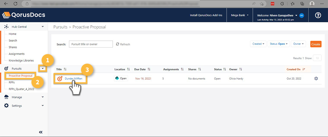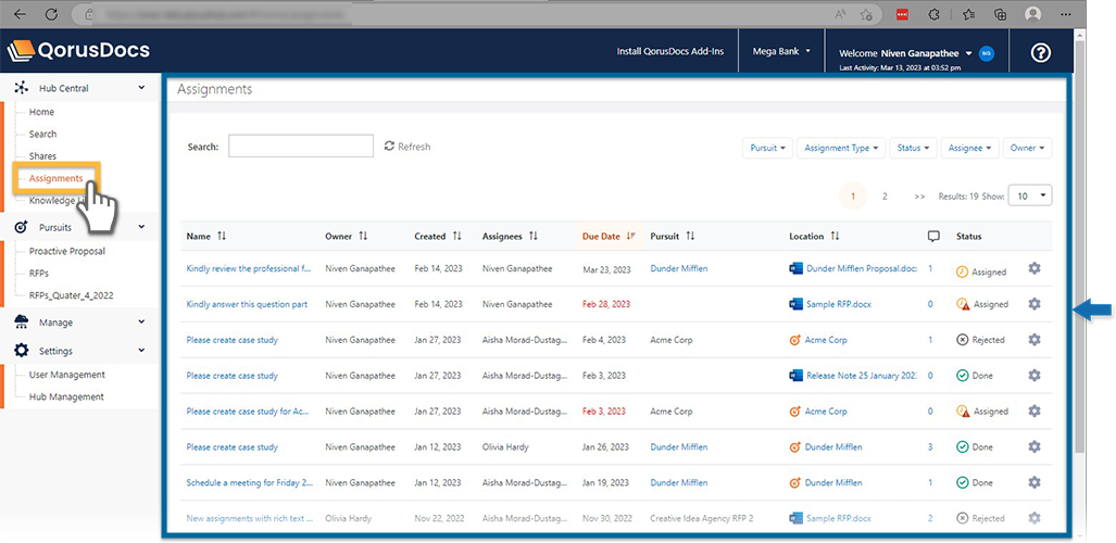 To manage an assignment, you can open the document where the assignment was created and use the QorusDocs Add-in. Alternatively, you can go to your QorusDocs Hub in your web browser and manage assignments across multiple documents and/or Pursuits from there.