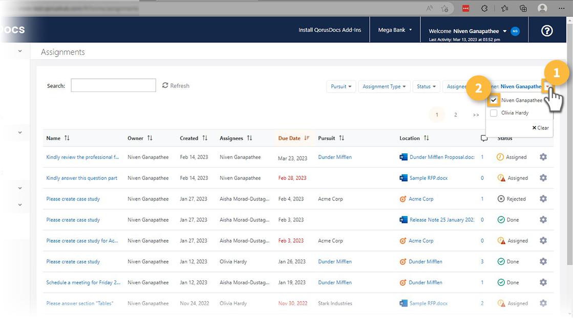 By default, QorusDocs will list all the assignments that have been assigned to you. To see the assignments you’ve created, use the ‘Owner’ filter and select your name: