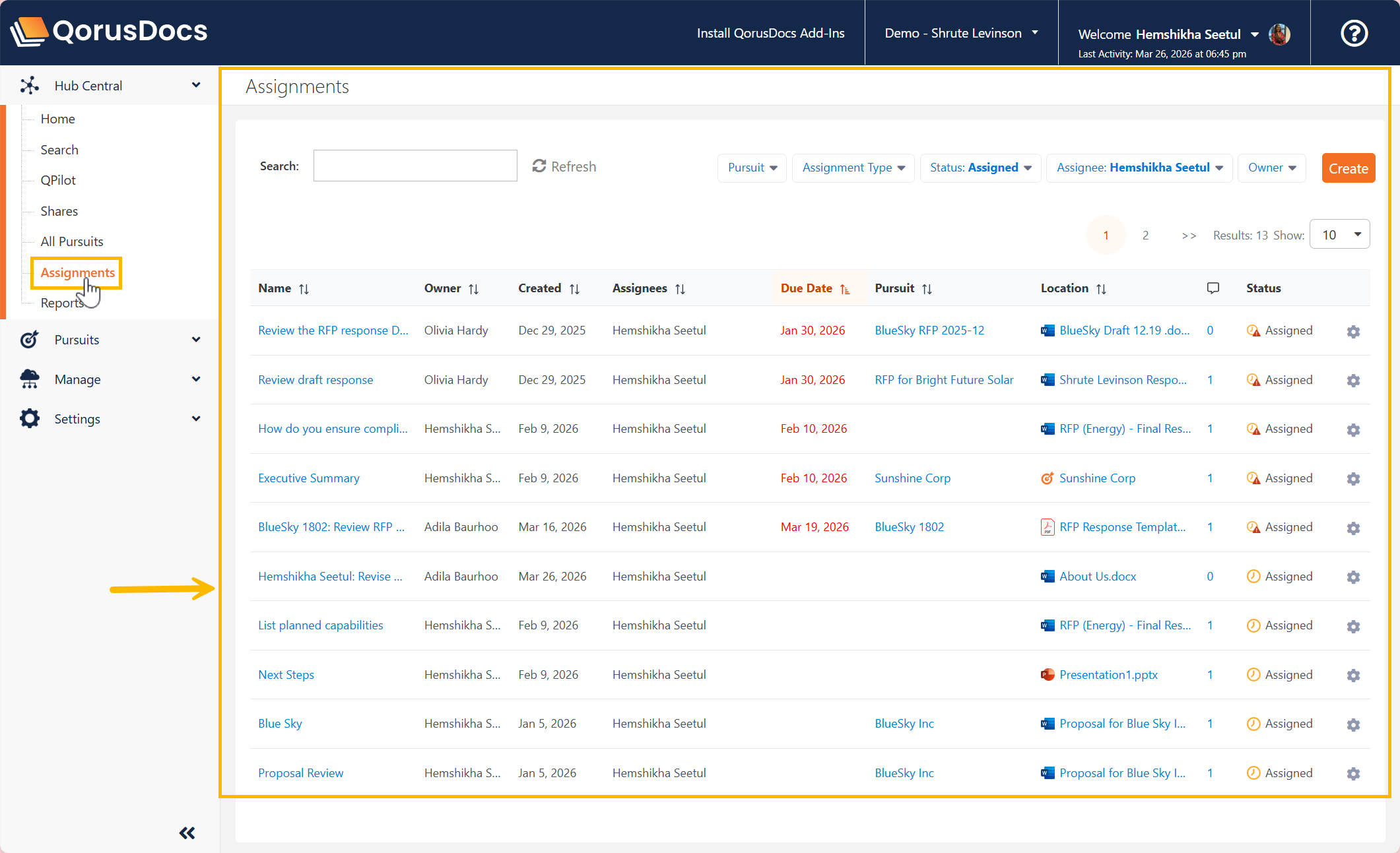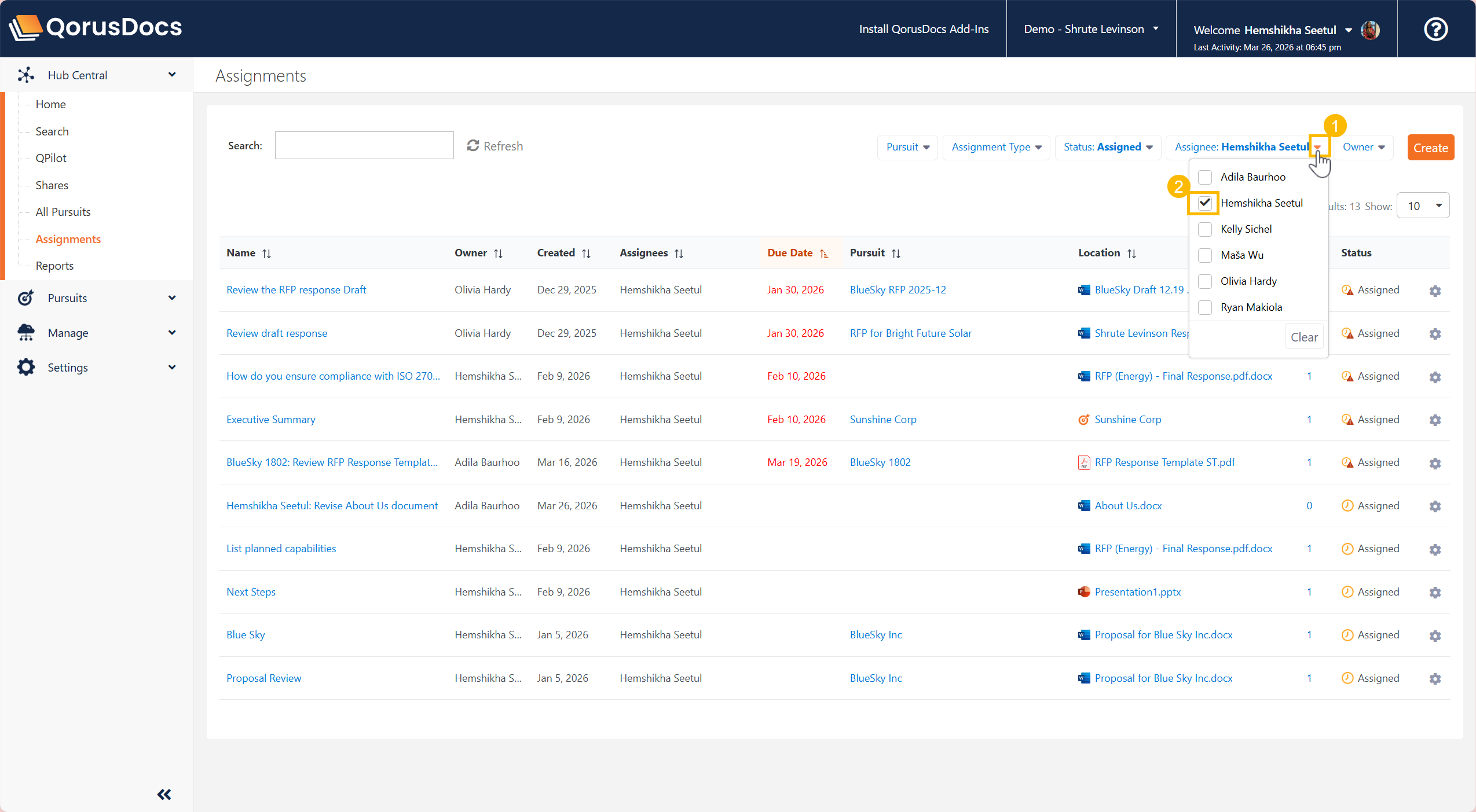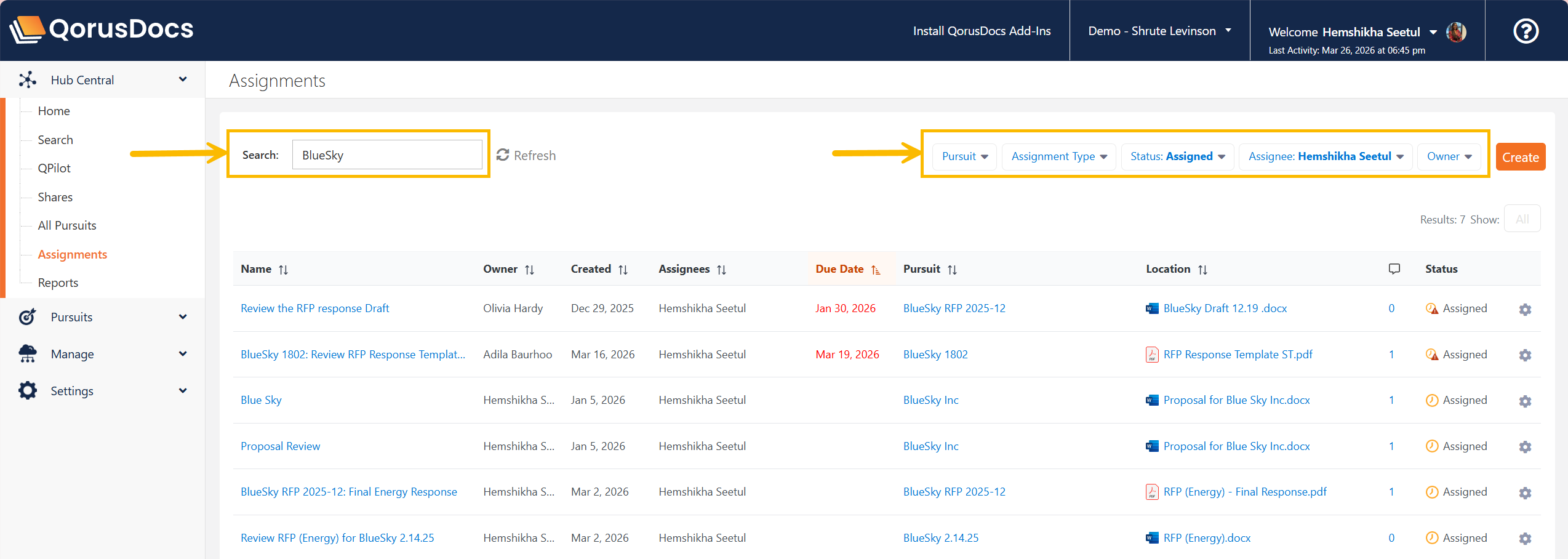 By default, QorusDocs will list all the assignments that have been assigned to you. To see the assignments you’ve created, use the ‘Assignee’ filter and select your name: