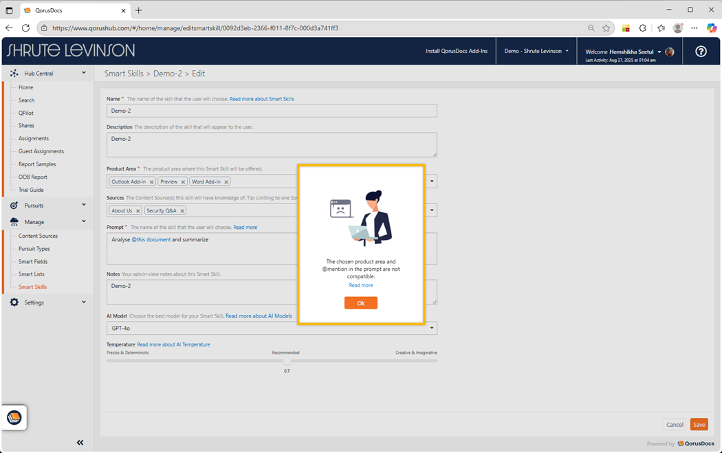 If you have already included an @ mention in your Smart Skill prompt and later make a change that conflicts with the selected Product Area, you will receive an error message. Additionally, if you have previously chosen one Product Area, you will only have the option to @ mention accordingly: