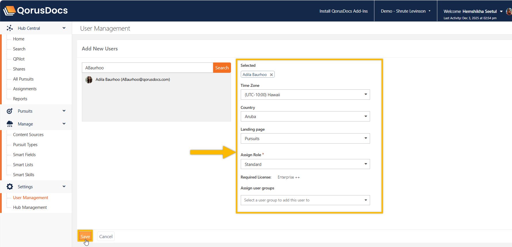 - Time zone and location: QorusDocs will use these details for timing work assignment notifications and other preferences.