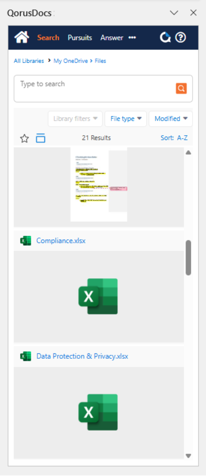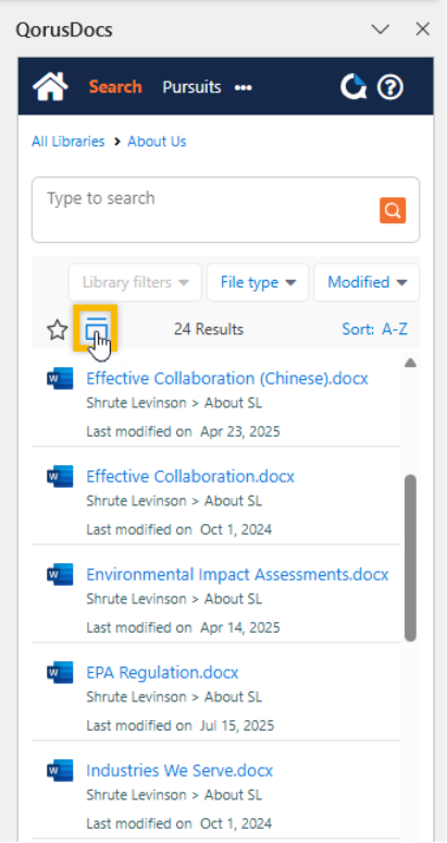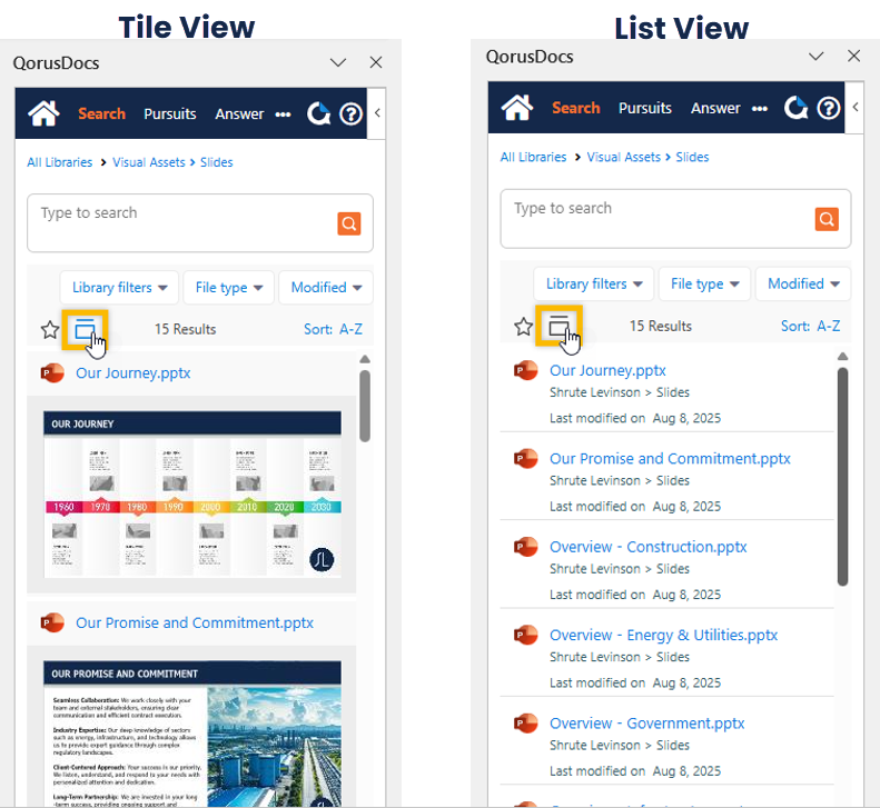 Whether you're using the QorusDocs Add-ins for Microsoft Word, PowerPoint, Excel, or Outlook, or working in Hub Central through your browser, you can easily switch between List View and Tile View for a more personalized and productive experience.