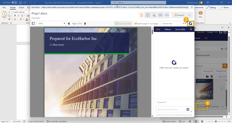 QPilot is QorusDocs’ AI Assistant. Working natively within Word, Outlook, PowerPoint, Excel and in your web browser, QorusDocs AI leverages your best content and industry leading AI skills insights to help teams draft, personalize, and refine documents—fast, collaboratively, and with the highest quality. QPilot is available to all users who have a QPilot license enabled.