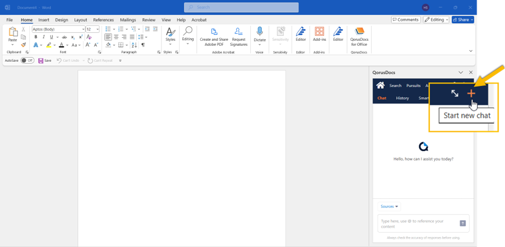 To initiate a new chat session, you can click on the + icon in the QorusDocs Add-in.