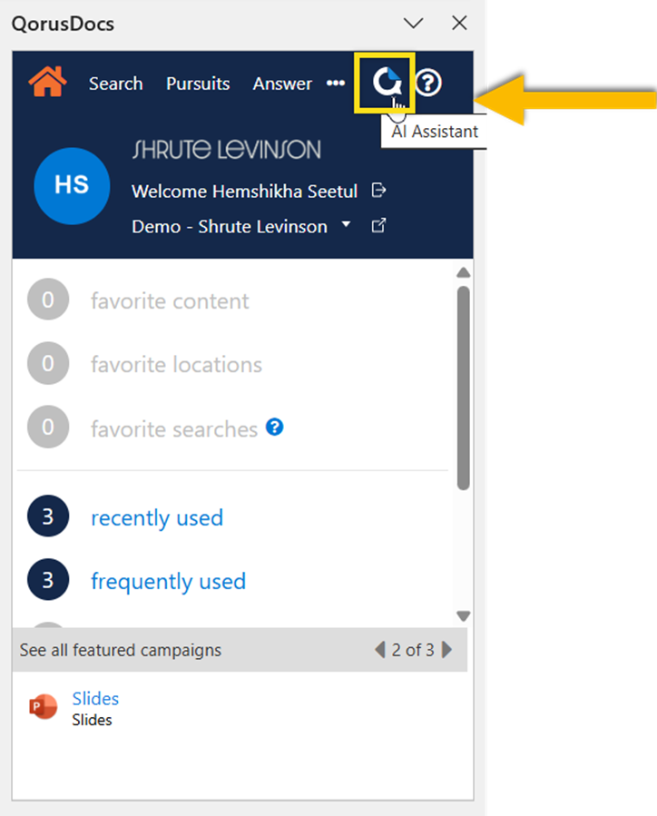 QPilot is available in all the QorusDocs Add-ins for MS Office, which includes Word, PowerPoint, Excel and Outlook. Upon opening the add-in, look for the 'Q' icon located in the top right-hand corner of your QorusDocs interface.