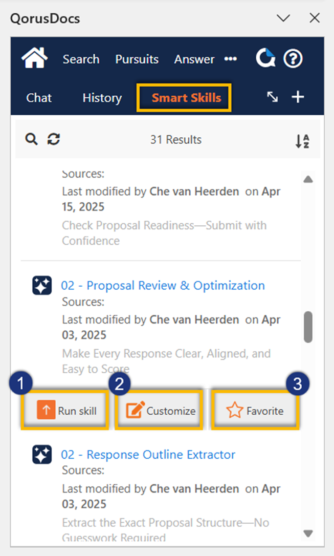 Upon clicking on a Smart Skill, you will have the option to "Run Skill", “Customize”, or "Favorite" it.