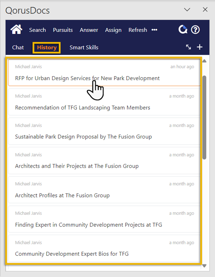 In the History tab you can access the last 250 past sessions with QPilot. Every interaction is captured and saved here for reference. This becomes particularly useful if you are switching documents or Microsoft Office apps and wish to pick up where you left off: