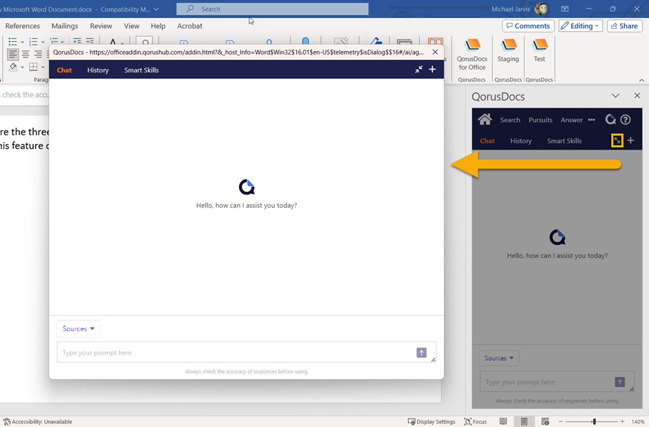 After clicking on the QPilot icon, you'll discover three main tabs: ‘Chat’, ‘History’ and ‘Smart Skills’. Additionally, you'll find options to open a dialog pop-out (Available only in Microsoft Office Add-ins) and Start a new chat.