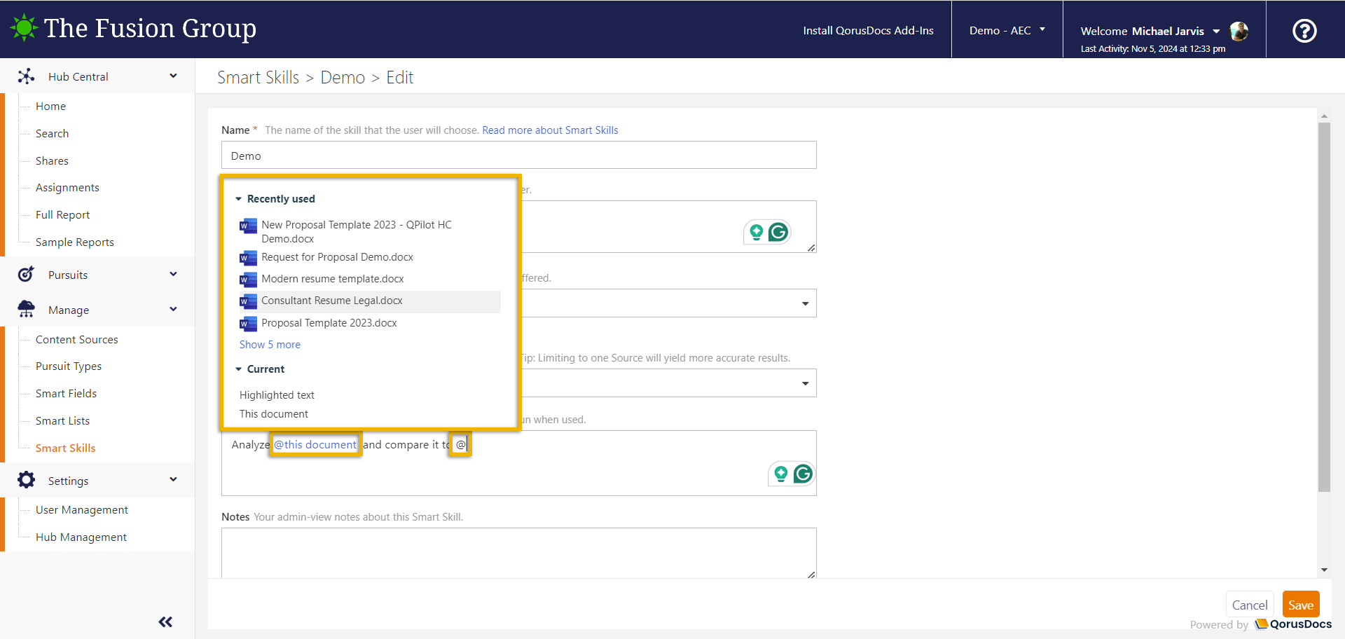 Incorporating the @ mention feature into your Smart Skills enhances user efficiency by streamlining access to relevant information. By referencing the current document, highlighted text, and Recently Used documents, users can quickly pull in pertinent data, making Smart Skills more dynamic and tailored to the organization's needs.
