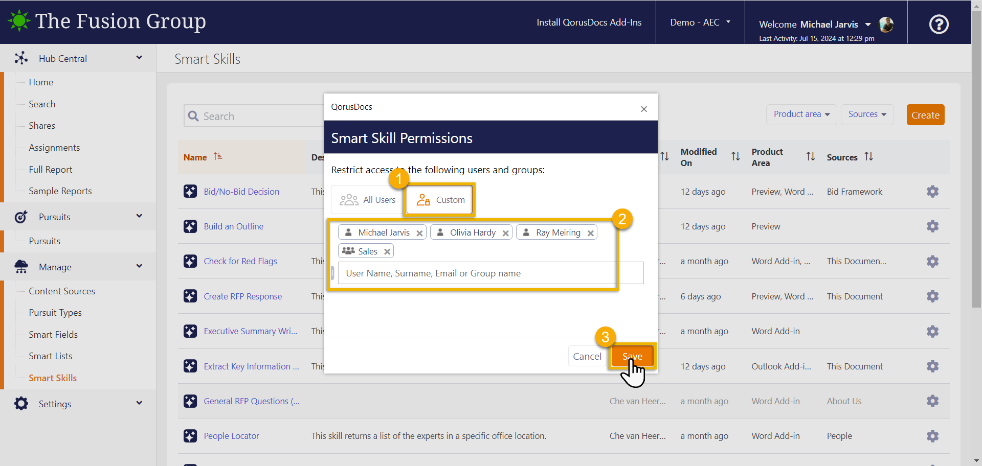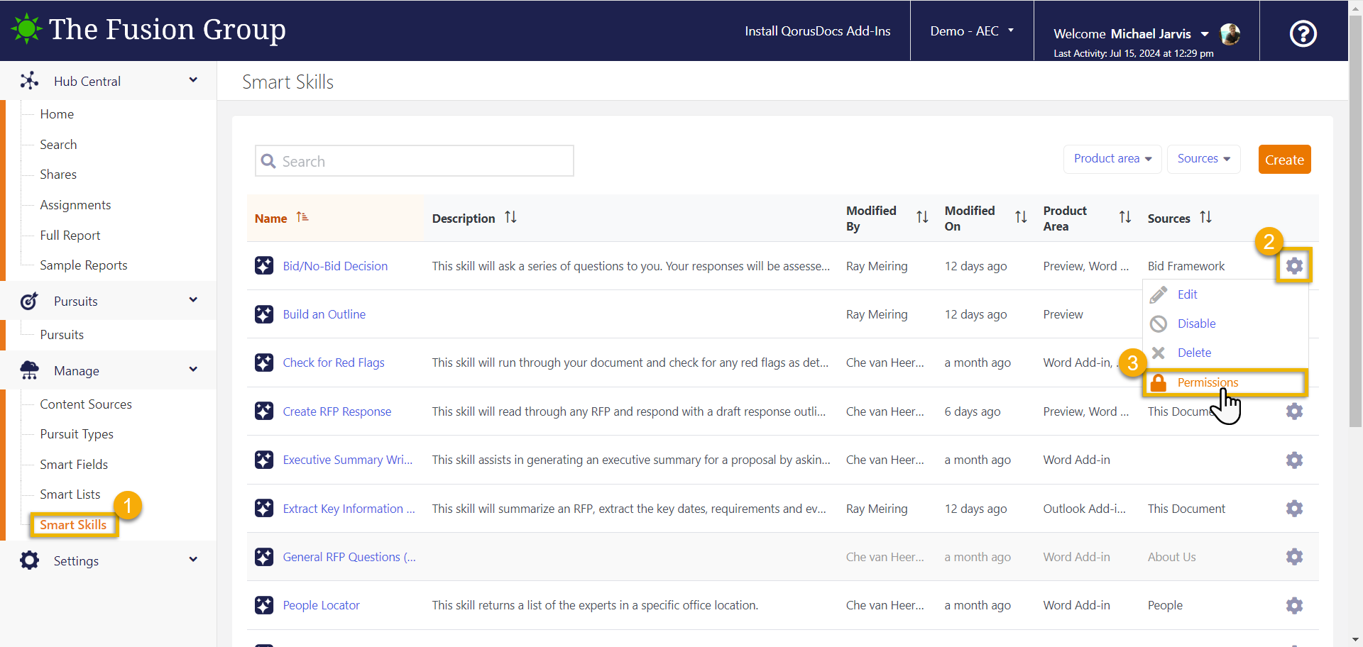 These skills, created and managed by Admin and Designer users at the QorusHub level, are tailored to align seamlessly with your organization's operational standards and procedures. By harnessing the power of natural language processing and advanced data analysis, Smart Skills empower users to streamline workflows, minimize manual effort, and elevate the quality of their proposals. From generating executive summaries to identifying potential red flags and offering bid/no-bid recommendations, Smart Skills revolutionize the way you approach RFP management, making every step more efficient, effective, and aligned with your organizational goals.