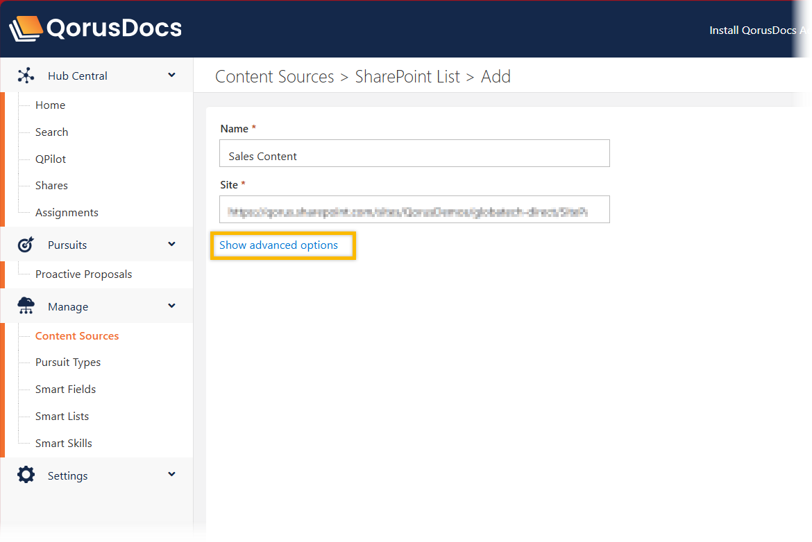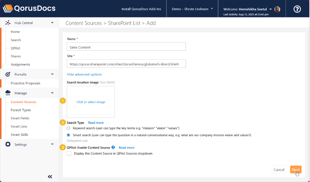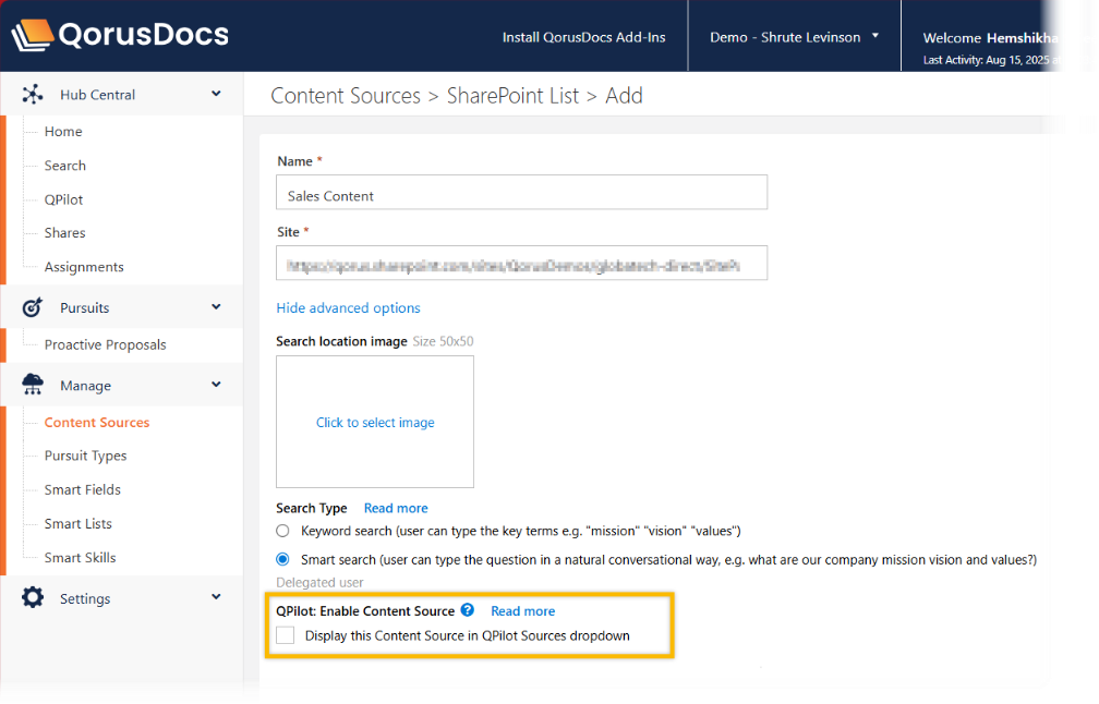 Enabling the option 'display this Content Source in QPilot Sources will allow users to reference this content source when prompting QPilot to generate or search a content.