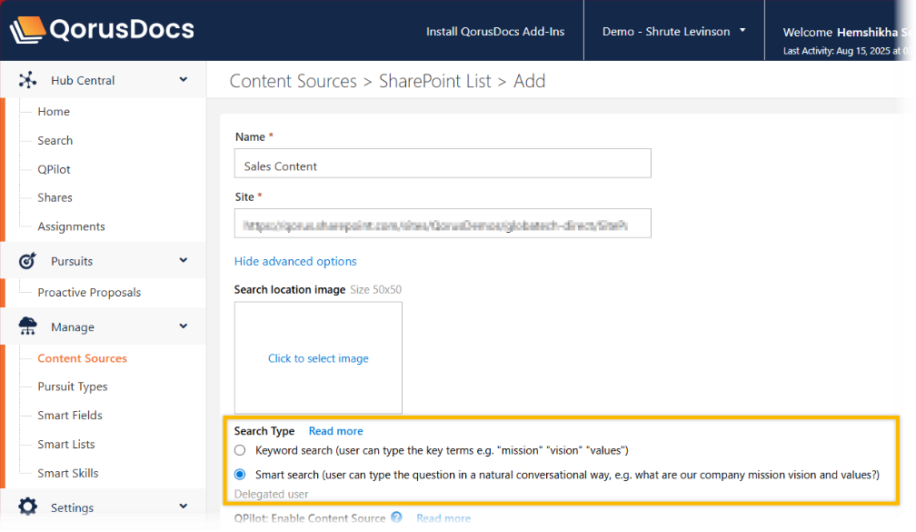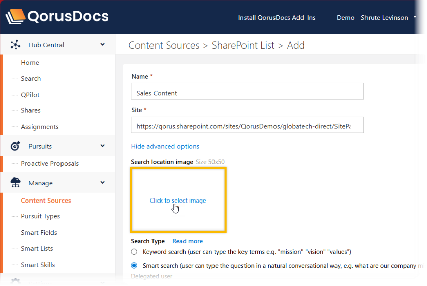 By default, QorusDocs will display the SharePoint logo next to SharePoint Online Content Sources in the Search pane. You can however add your own custom images for each content source, making it easier for users to differentiate between Content Sources, especially if you have many connected to your QorusDocs Hub.