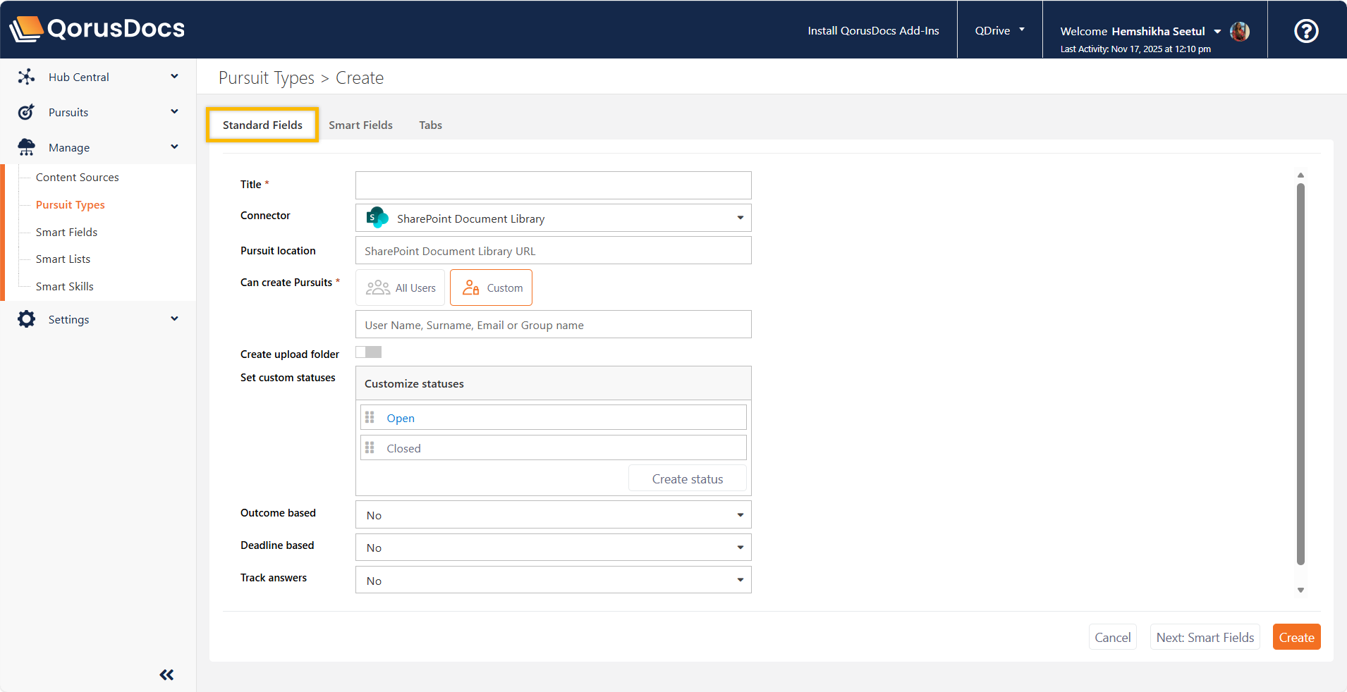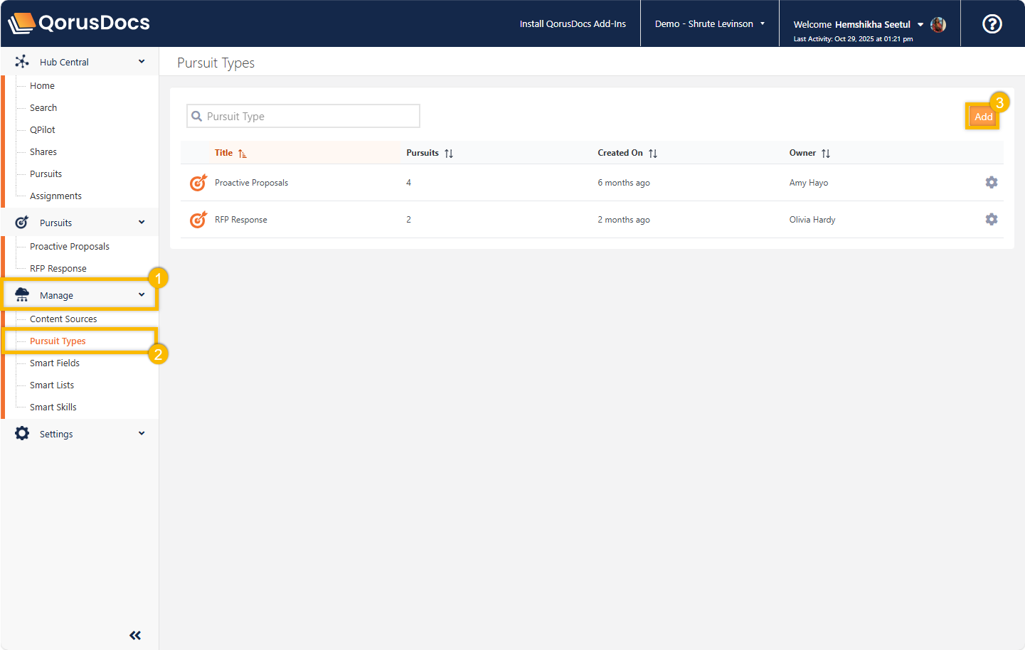 Before you can create a Pursuit, you'll need to have at least one Pursuit Type configured in your QorusDocs Hub.