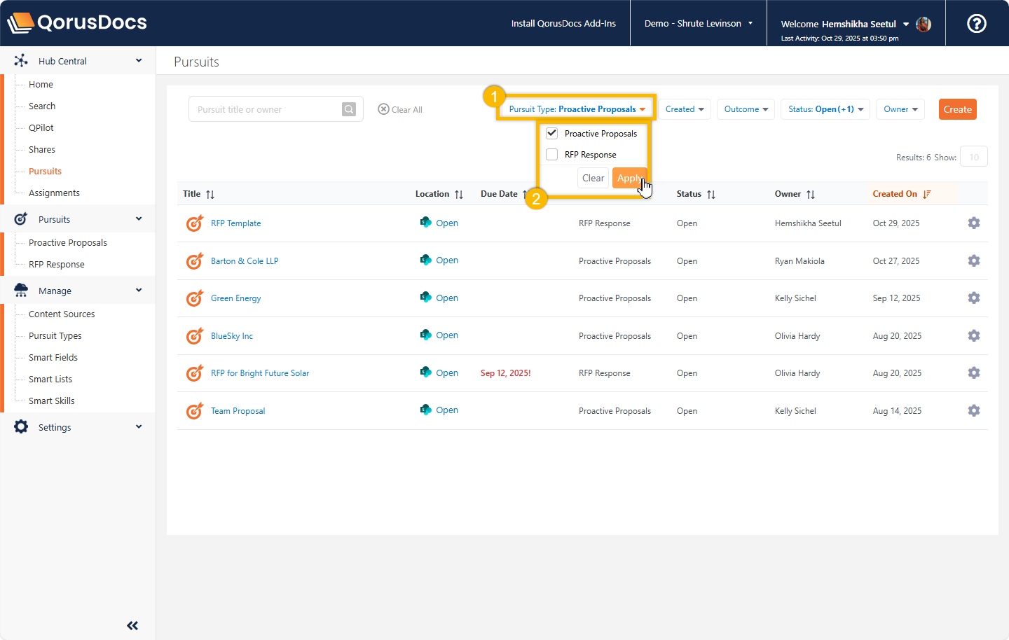 You can also filter the Pursuits by Pursuit Type, click on the drop down, choose the Pursuit Type and Apply.