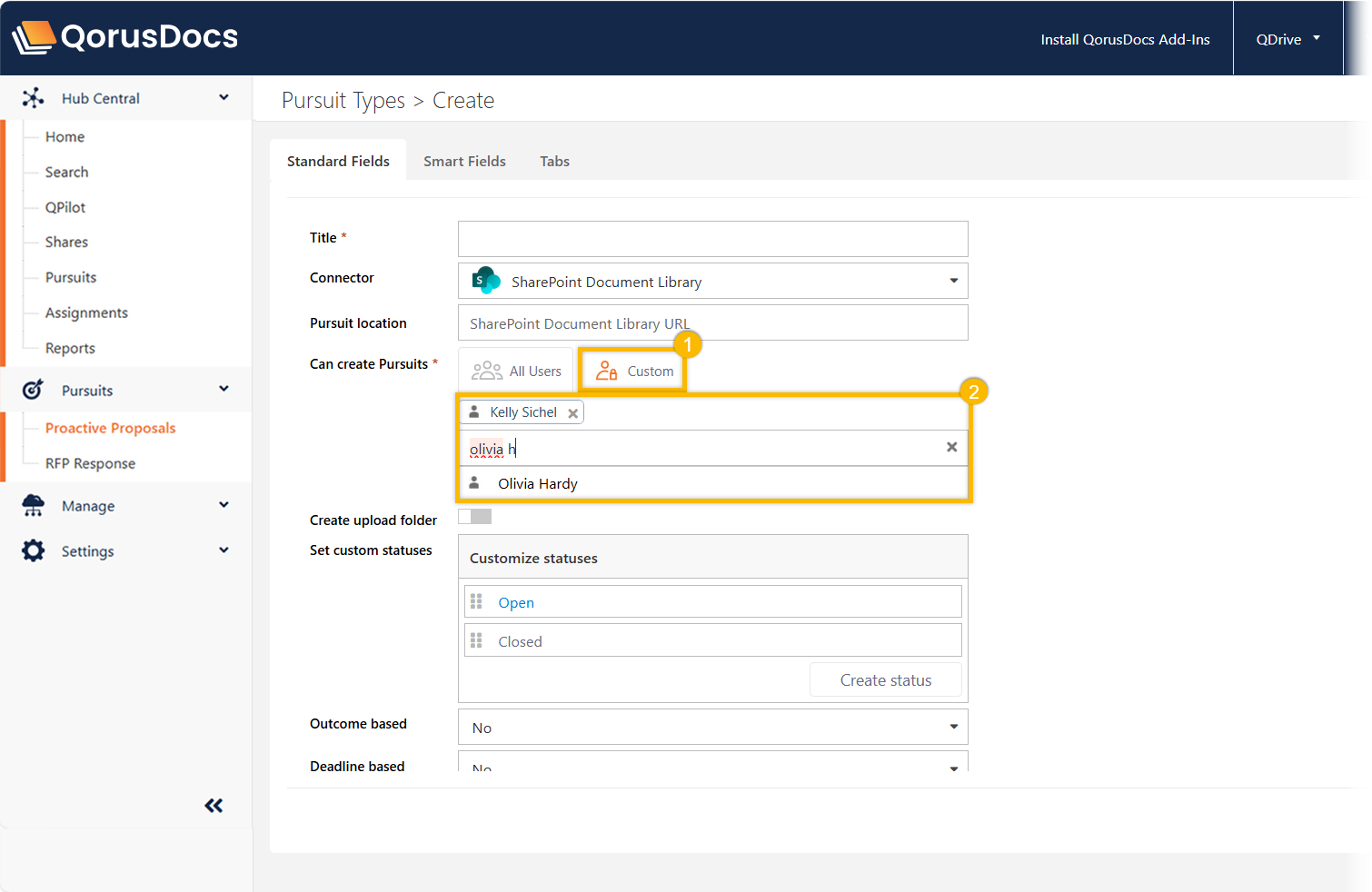 - Default Pursuit Members: QorusDocs can automatically add Team Members to new Pursuits. If you select 'All Users', then all Standard and Admin users will be able to see the Pursuit in the QorusDocs UI. If you select 'Custom', you can select individual team members by searching for them using their username, surname, or email - or you could add the name of one or more user groups. Pursuit owners and admins are free to modify the list of Pursuit members after the Pursuit has been created.