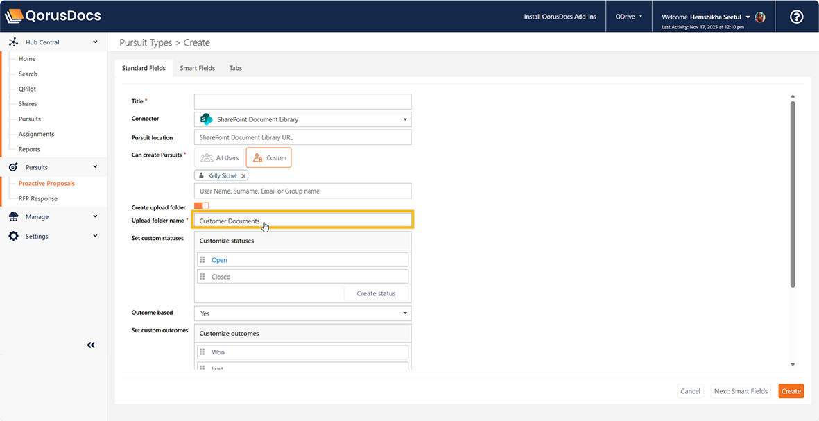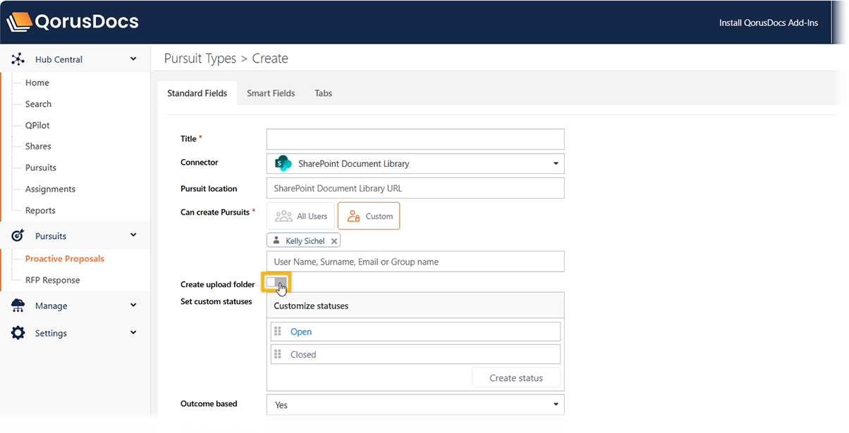 Every time a new Pursuit is created using this Pursuit Type, QorusDocs will create a new folder with that name and save any documents the user chooses to upload upon Pursuit creation to that folder.