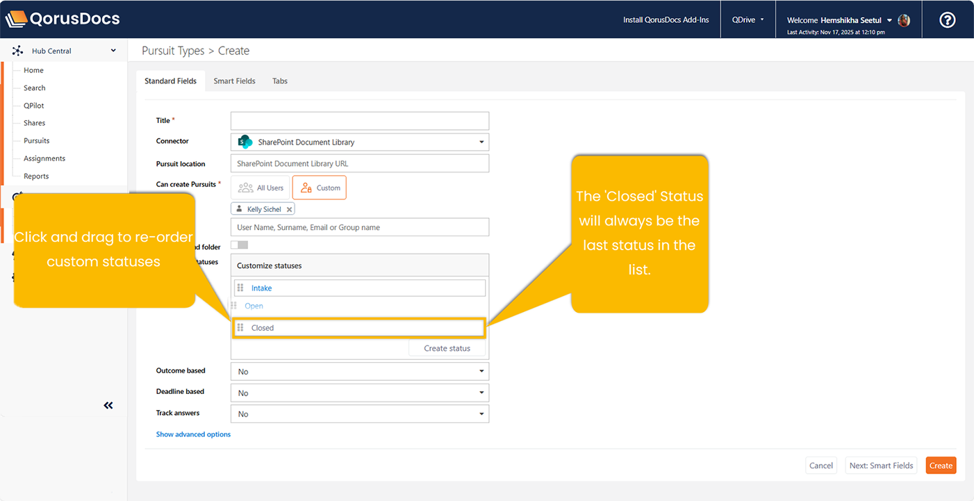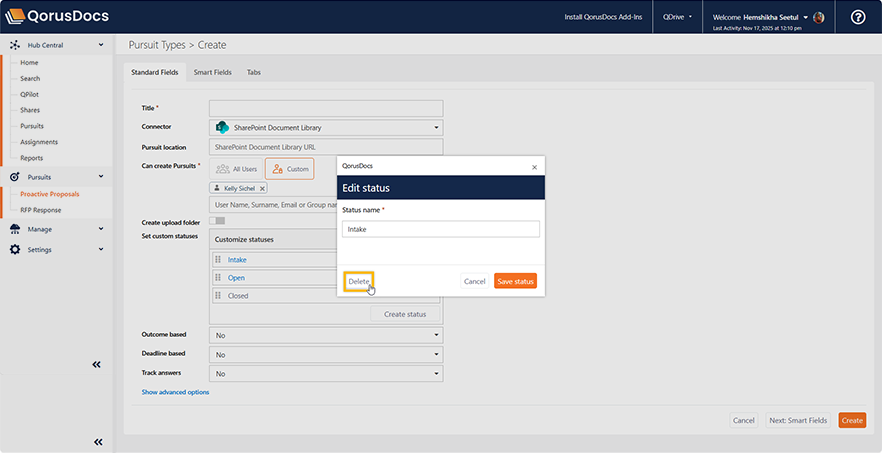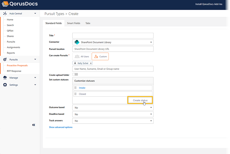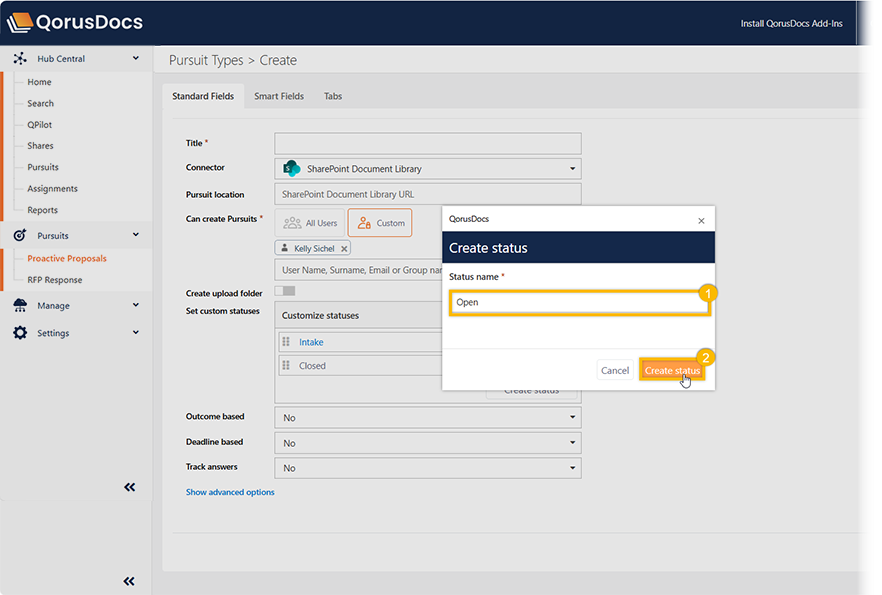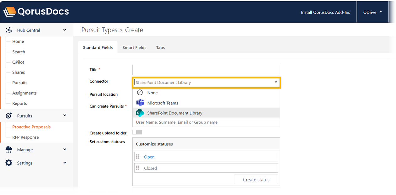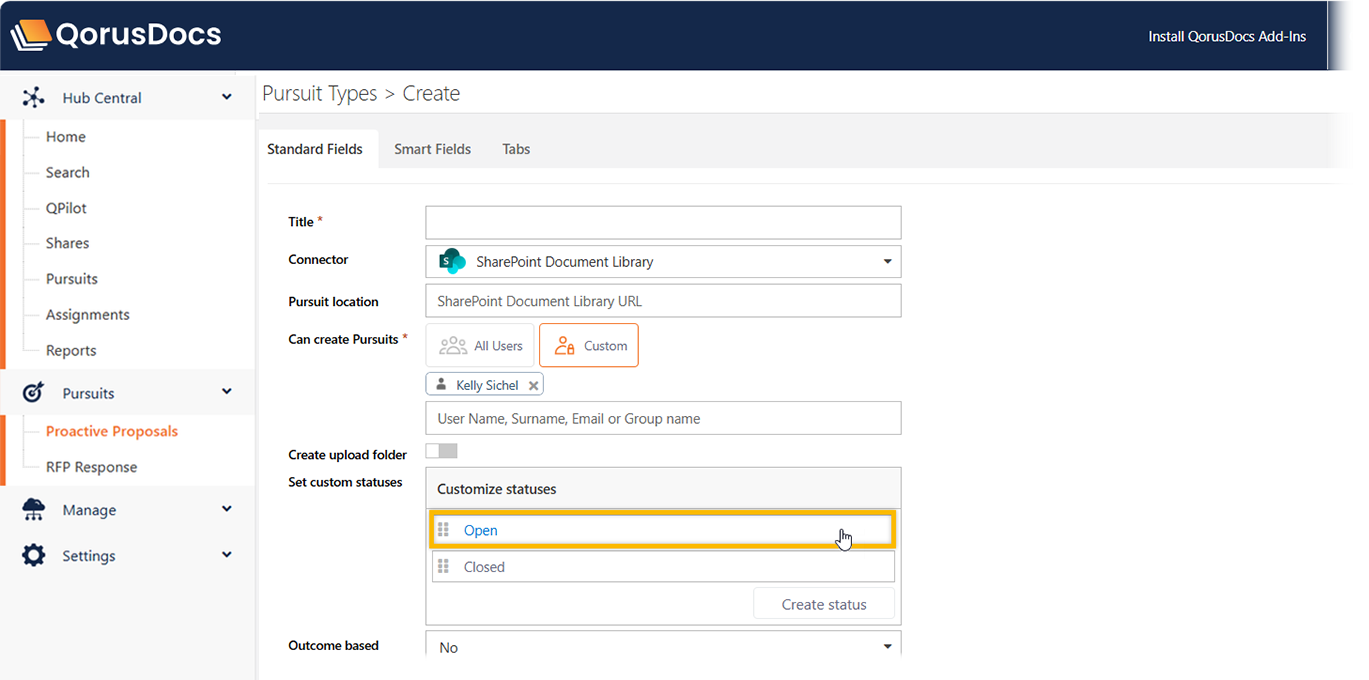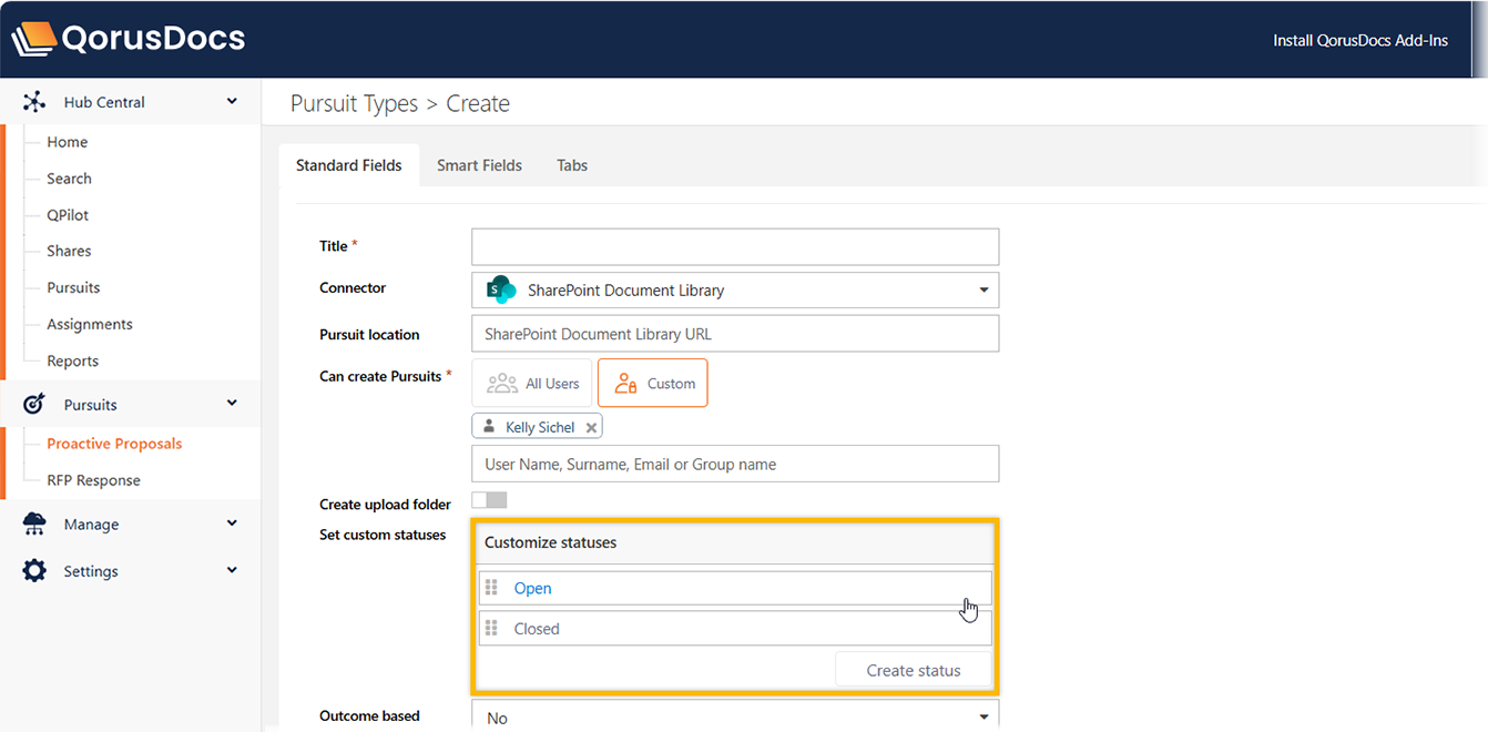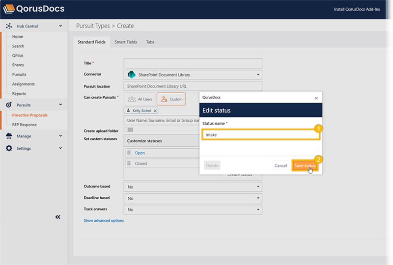 For each Pursuit Type, you can create a custom set of up to 9 statuses, alongside QorusDocs' default 'Closed' status. This allows you to effectively track the various stages a Pursuit progresses through as part of your business processes.
