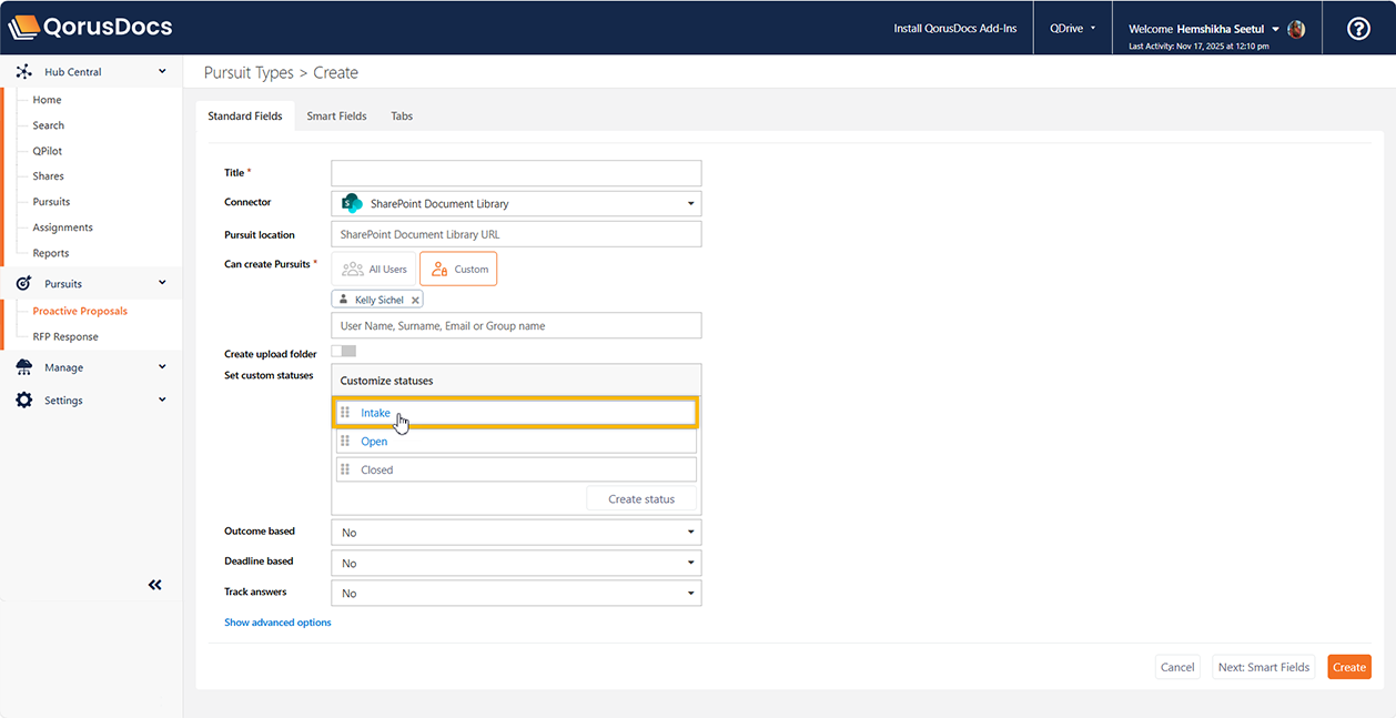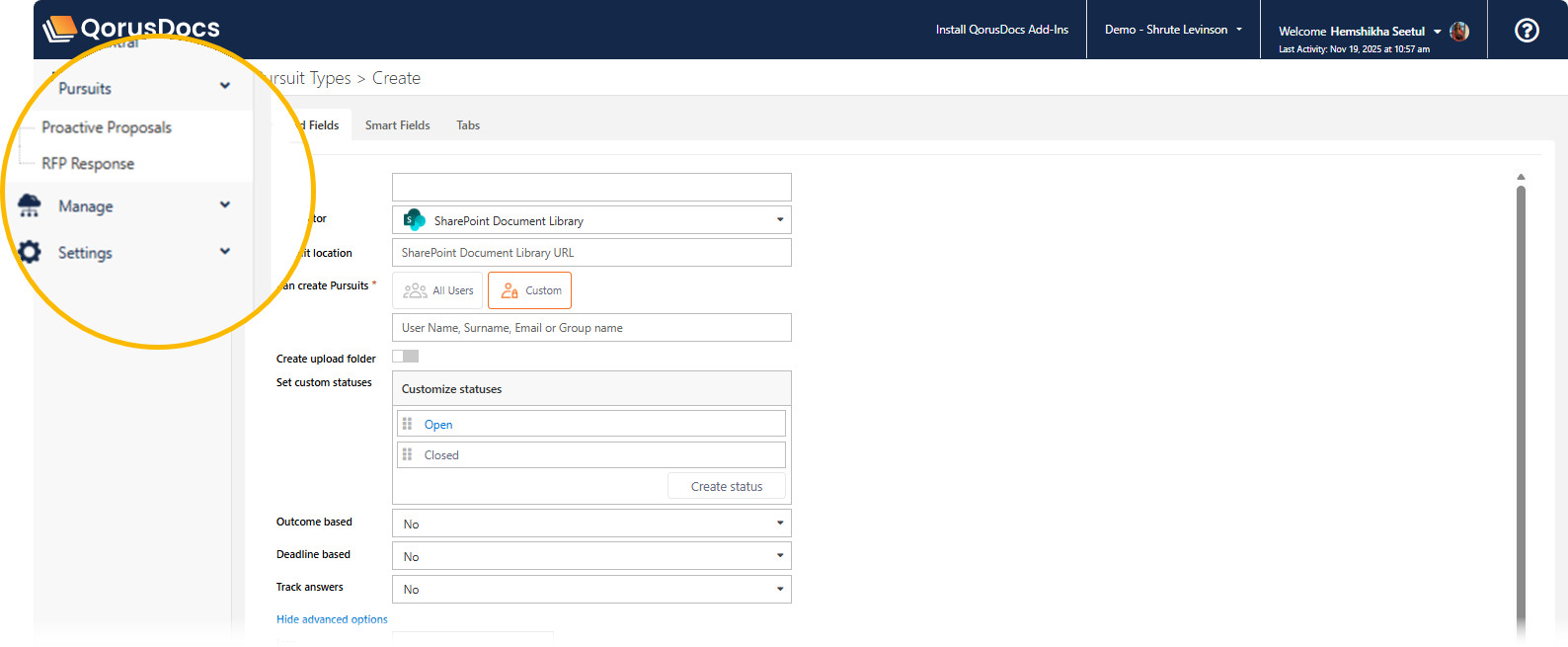 For each Pursuit Type, you can define key details such as the designated storage location for related documents, the permissions for who can create Pursuits of this type, and the preferred methods for tracking and reporting on these Pursuits.