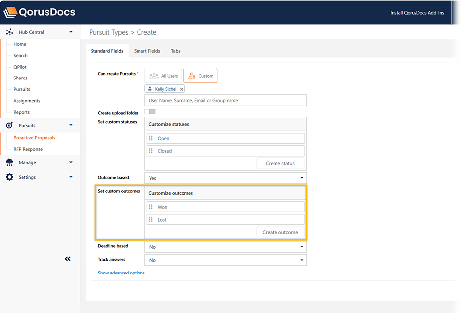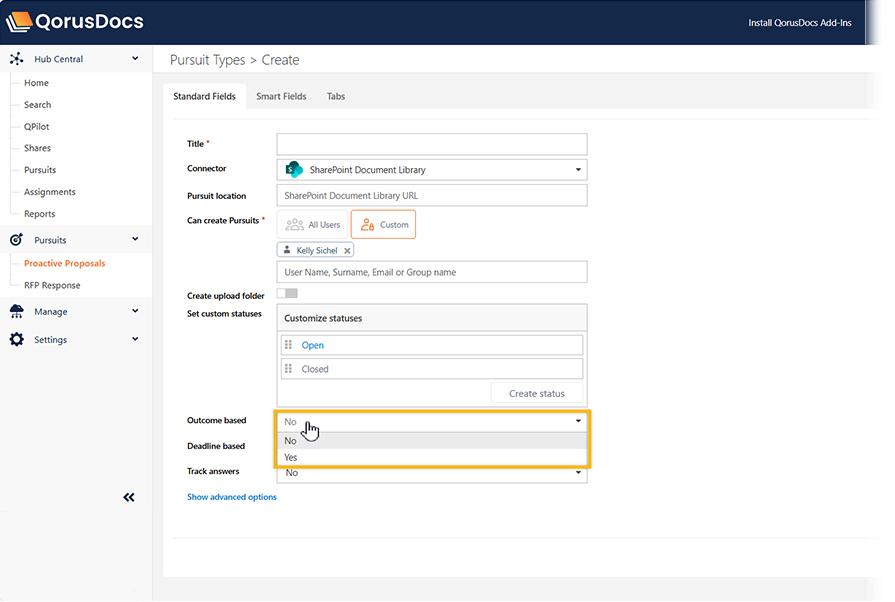 'Track Answers' works with QorusDocs' AI-enabled Auto Answer. Auto Answer is an AI-based capability used to bulk answer RFP questions, IT Security Questionnaires, or any other vendor questionnaire in Q&A format in Word or Excel. If users will be making use of the Auto Answer feature while working on the Pursuit Type you are defining, it is probably a good idea to turn on 'Track Answers' by choosing 'yes' from the drop-down menu.