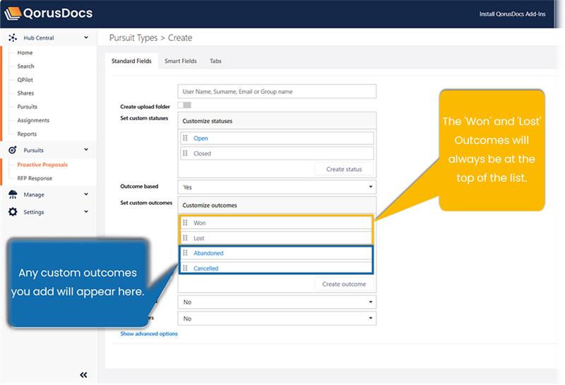While statuses are generally used to keep track of the various 'in-flight' stages of a Pursuit, outcomes are used to keep track of the overall end-result. Keeping track of outcomes is entirely optional. If enabled, users can specify the outcome of a Pursuit once the Pursuit status is 'Closed'.