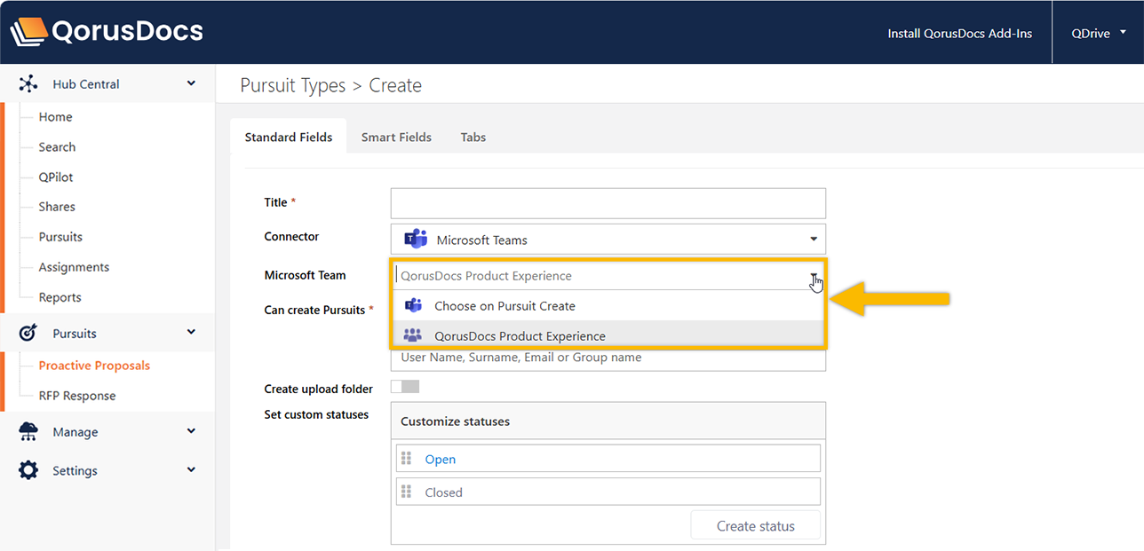 - Option 1 - Select a Team: You can use the new drop-down menu that appears on your screen and that lists all the Microsoft Teams you have access. If you select one of these Teams, this will restrict the saving of Pursuit content to the particular Team. Every time users create a new Pursuit using this Pursuit Type, QorusDocs will automatically create a new channel in the MS Team you specify for the new Pursuit.