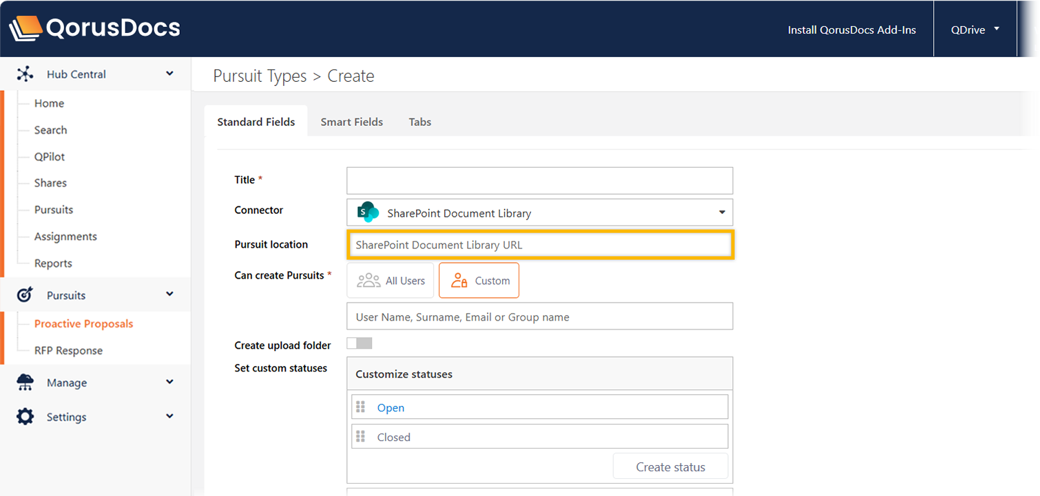 - If you would like to restrict where Pursuit content for this Pursuit Type to a specific library, then copy and paste the SharePoint Library URL of that library. Every time users create a new Pursuit using this Pursuit Type, QorusDocs will automatically create a new folder in the SharePoint Online library you specify for the new Pursuit.