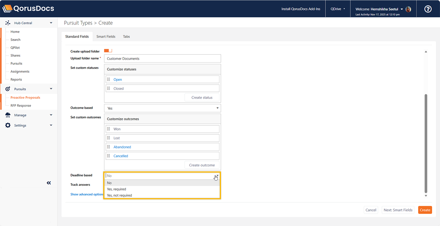 This streamlines the process for end users, saving them valuable time when creating new Pursuits while ensuring alignment with your internal business processes.