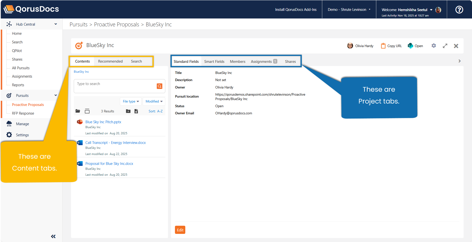 This feature saves valuable time by automatically pre-filling Smart Field personalization forms with information already captured at the Pursuit level. Whether users are creating new Pursuit documents or adding smart-enabled content, there’s no need to re-enter the same details. This seamless process ensures efficiency and eliminates repetitive data entry.