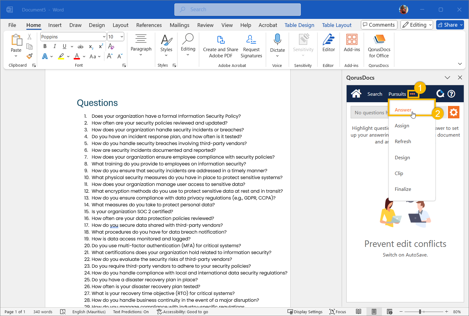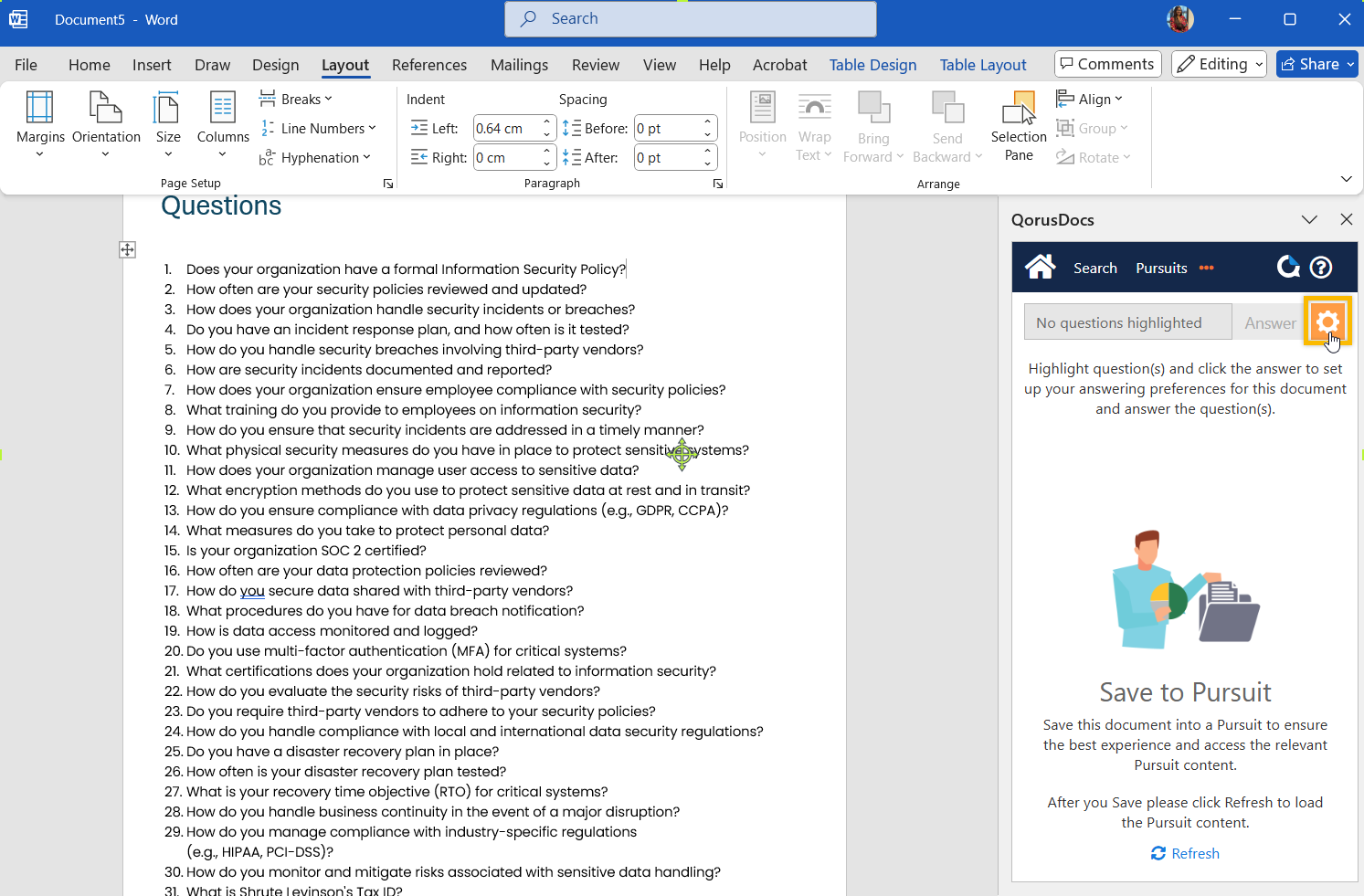 Before you can use the magic of AI with Auto Answer, your QorusDocs should have at least one Auto Answer content source configured. You can learn more about how that works here. Then, if you haven’t done so already, you’ll also need to have the QorusDocs Add-in installed in Word.