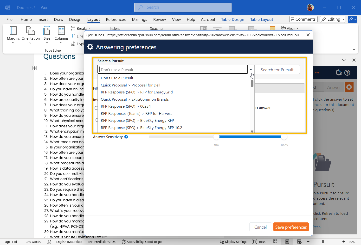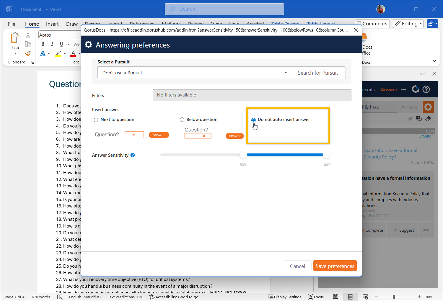 This means that if you’d like to apply different filters, use a different Pursuit, or adjust the sensitivity for another set of questions in the same Word document, you can do so by clicking on the gear icon and adjusting your answer preferences. Your adjusted preferences will apply to the questions you select next.