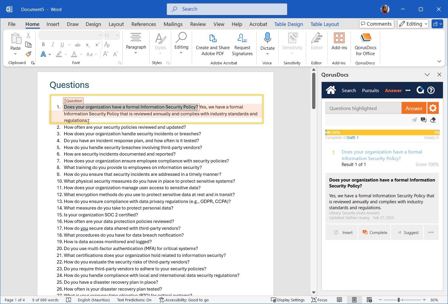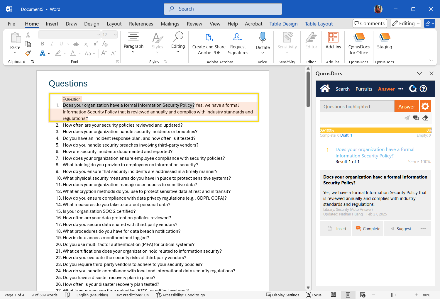 This option inserts the answer immediately below the question, on a separate line, while other possible matches are made available for you to review in the QorusDocs Add-in:, like this: