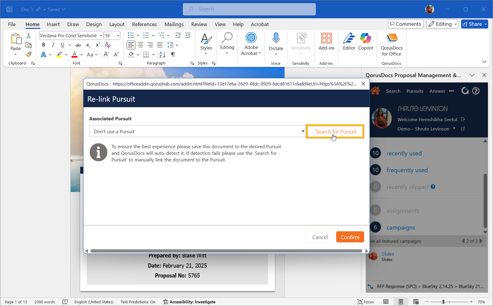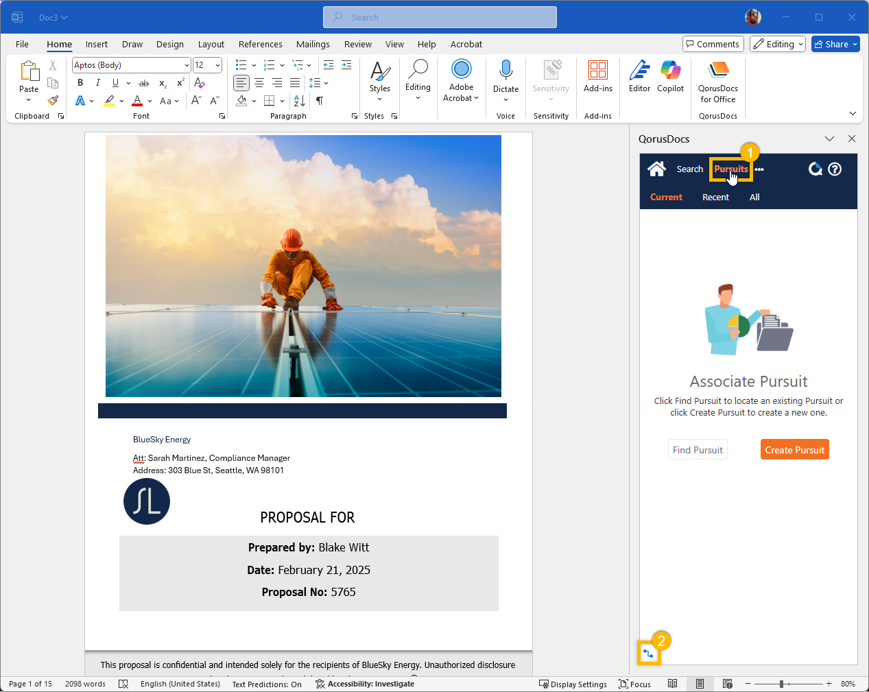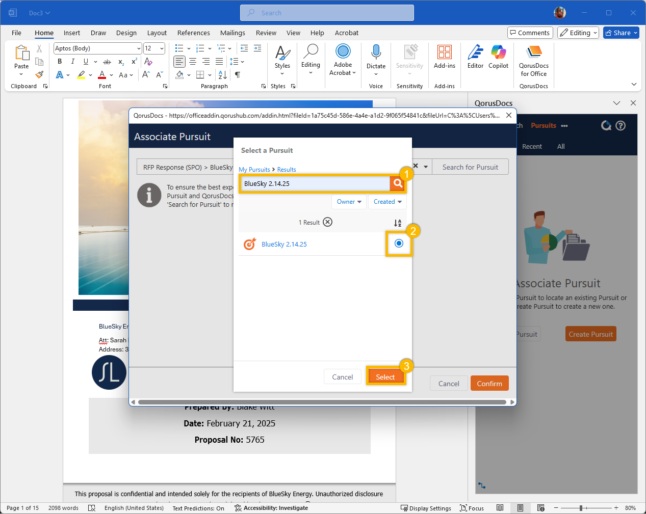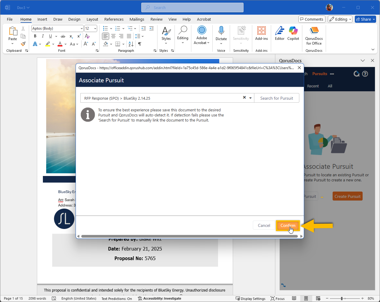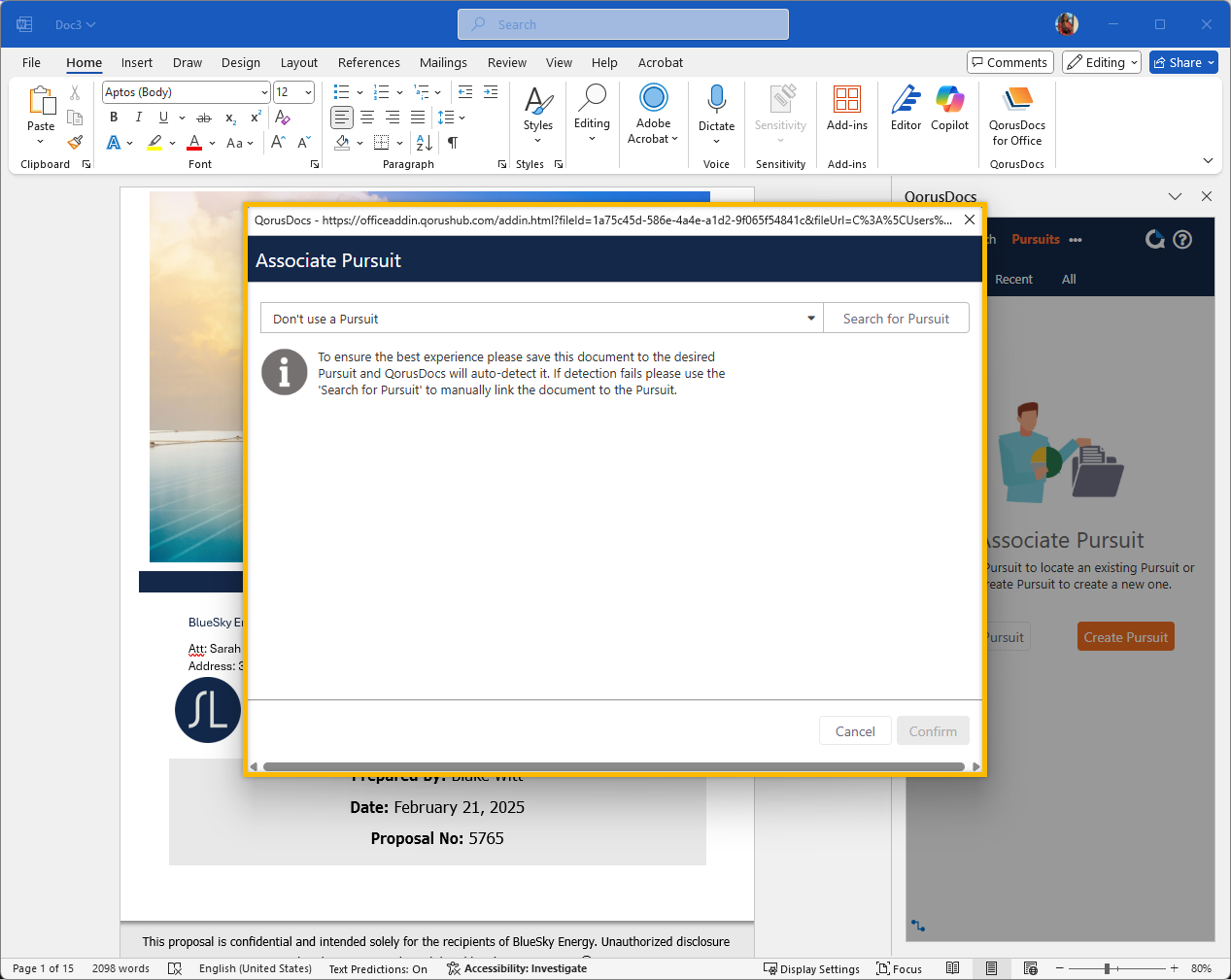 If for some reason, QorusDocs is unable to auto-detect the Pursuit your document should be associated with, you can fix that by manually associating it to a Pursuit.
