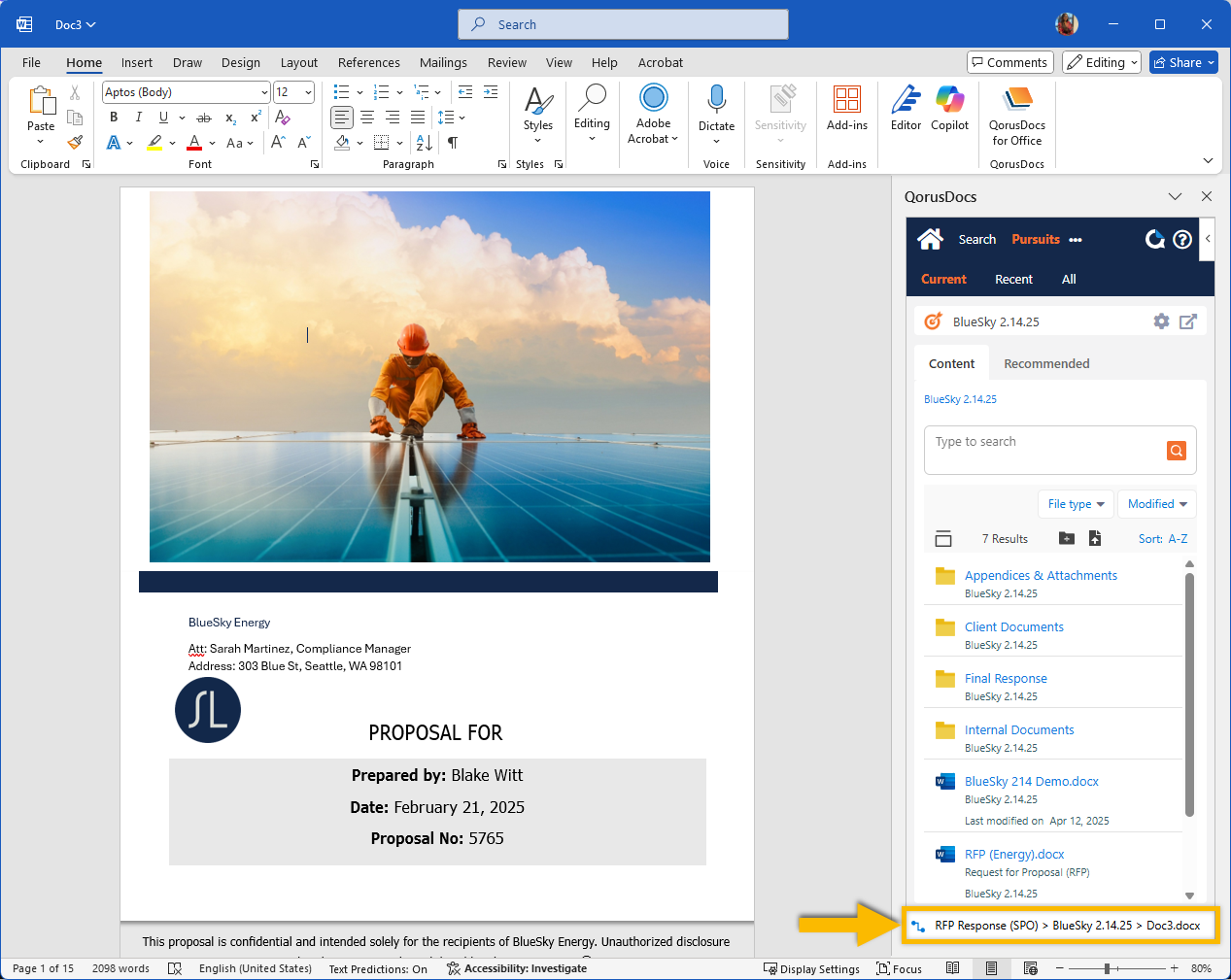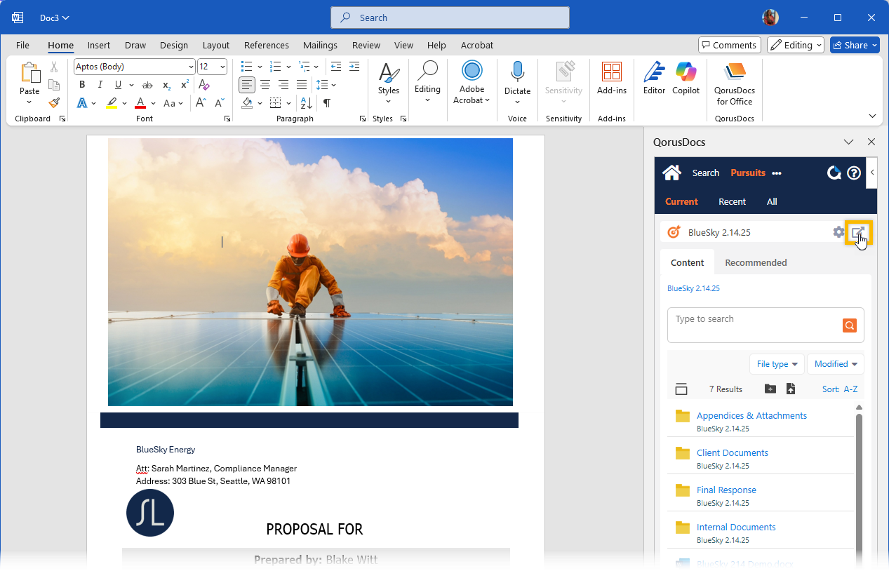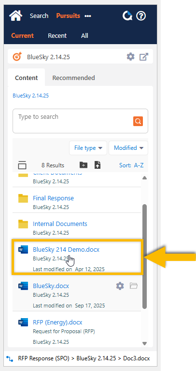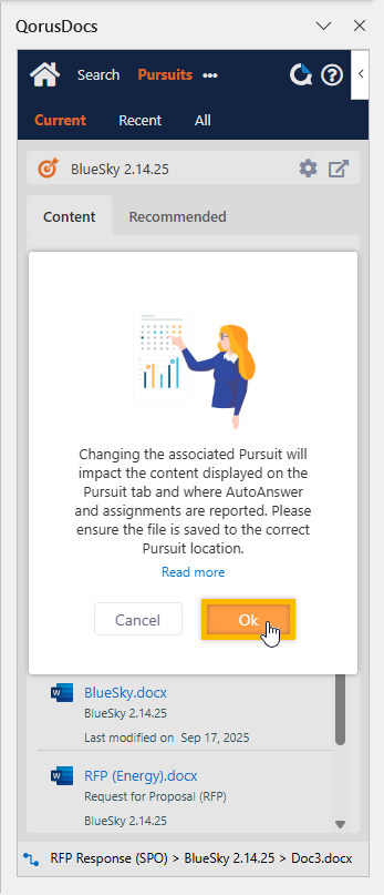 The QorusDocs Add-in will automatically refresh, and you should now see the Pursuit documents and recommended content for the Pursuit you’ve selected: