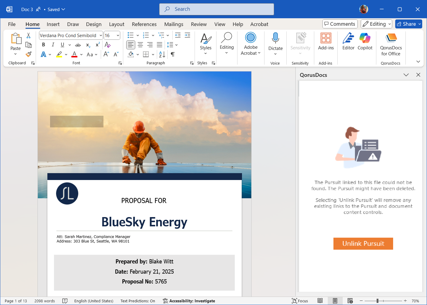 If you want to start over and have QorusDocs treat it as a brand new file, then click on 'Unlink Pursuit'. This will cause QorusDocs to stop associating this document with the original Pursuit (let's call this Pursuit A) and to refresh the Add-in.