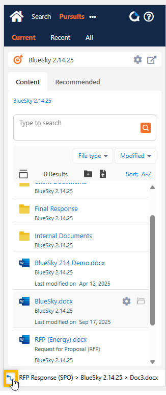 When a file is associated with a Pursuit, you'll be able to see the Pursuit Type and the name of the Pursuit in the breadcrumb at the bottom of the QorusDocs Add-in.