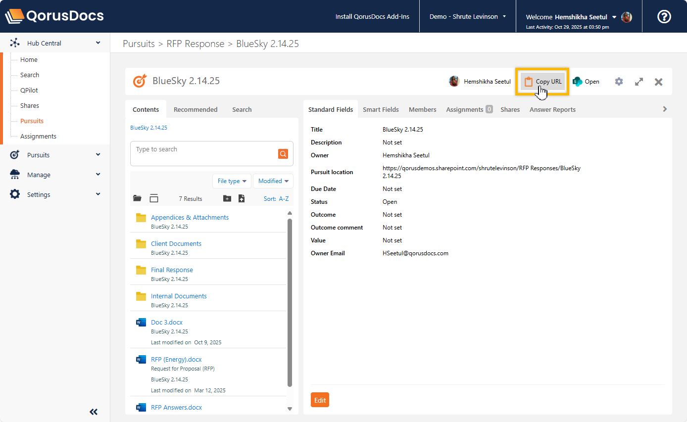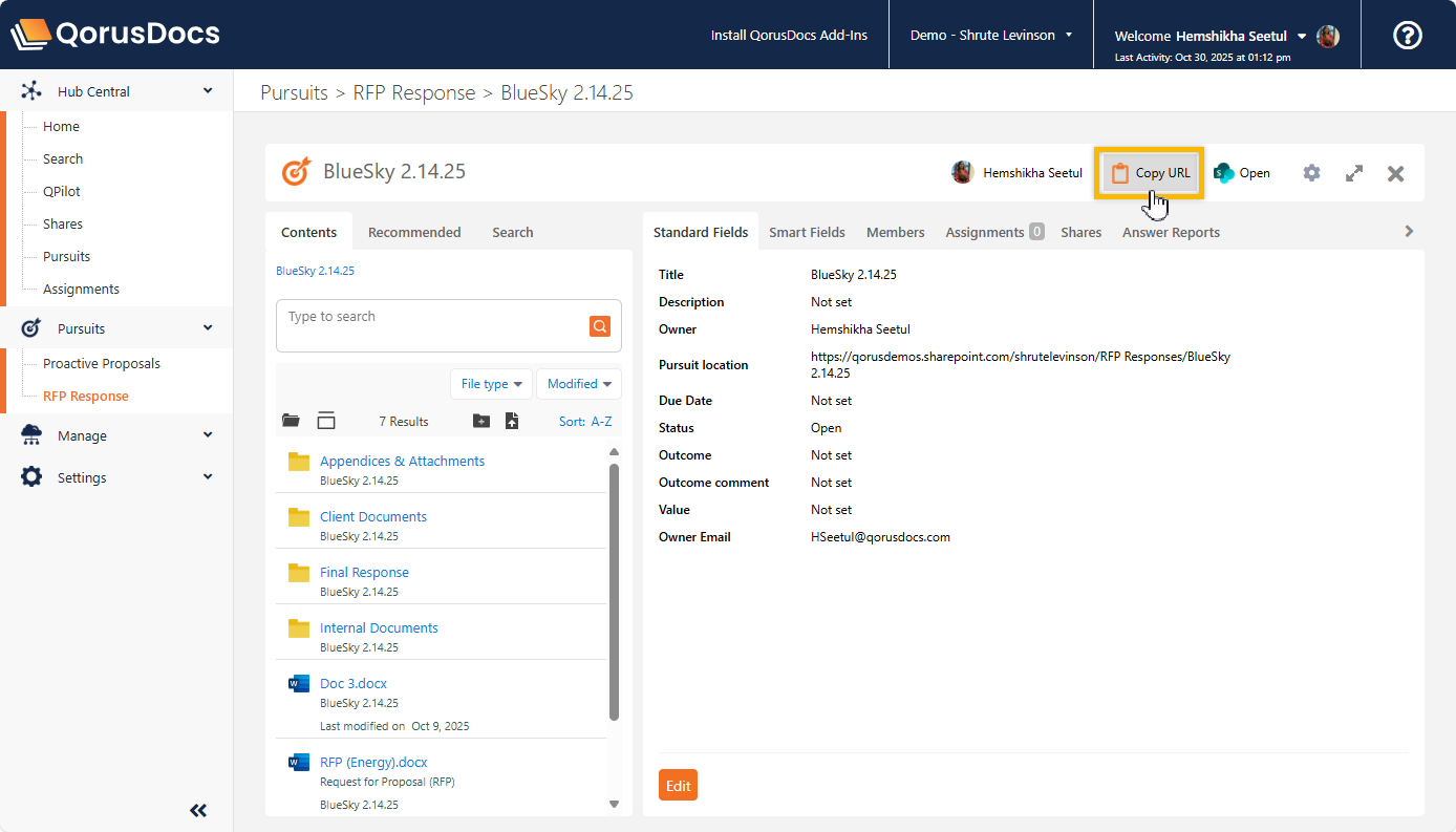 One way to do that is to go to the Pursuit workspace in QorusDocs Online using your web browser, where you can click on ‘Copy URL’ to copy the file storage location link: